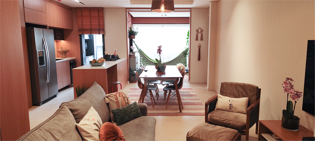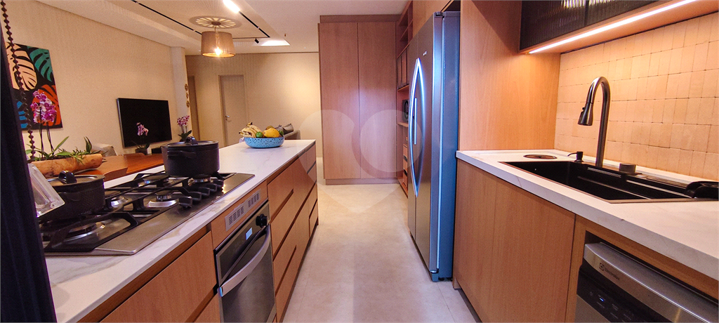Cozinha funcional e elegante, integrada ao living, com eletrodomésticos embutidos — incluindo geladeira, fogão, forno, máquina de lavar louça e lava e seca. O imóvel conta ainda com lavabo e área de serviço bem distribuída. O apartamento dispõe de 2 vagas de garagem, com infraestrutura para carros elétricos.