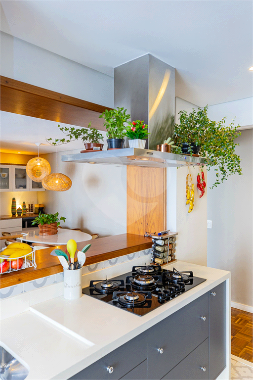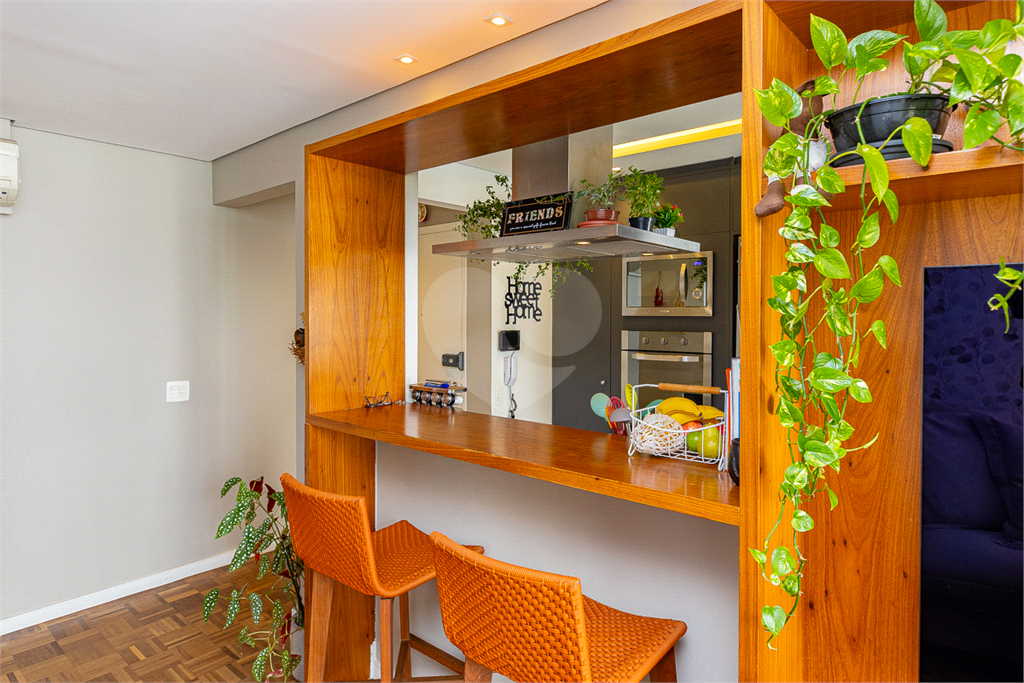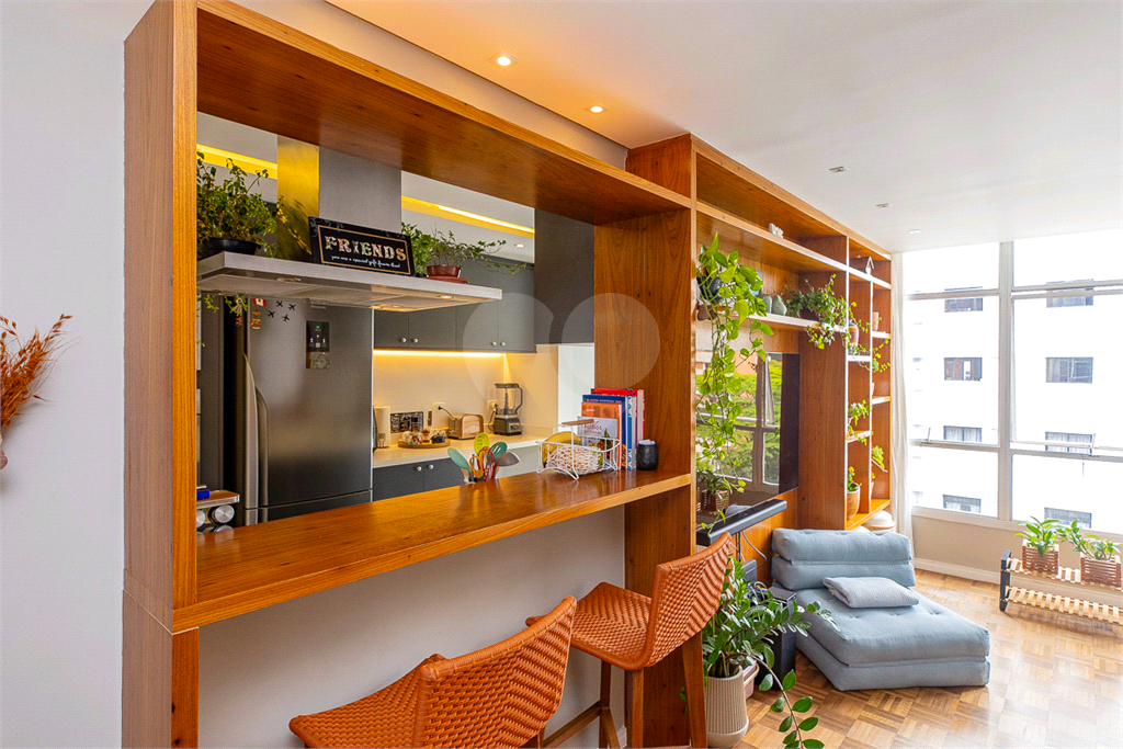 Uma bancada charmosa, dando a possibilidade de fazer refeições rápidas diariamente com essa integração da cozinha e da sala.