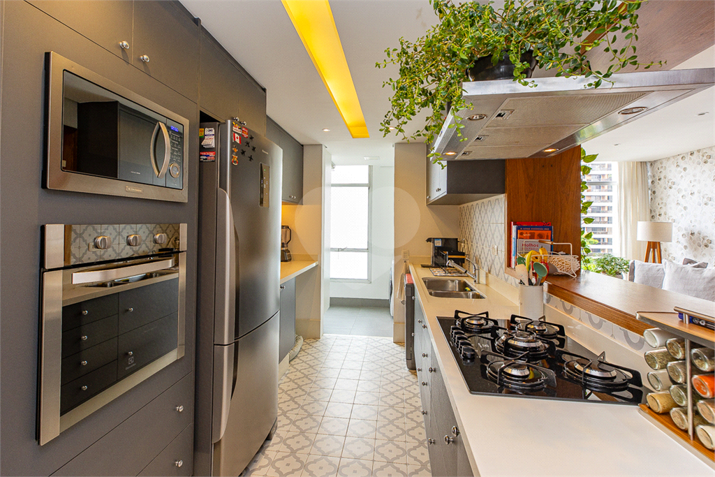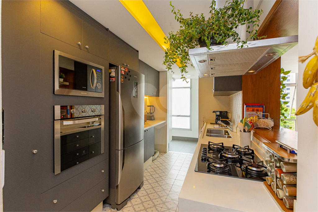 Cozinha Gourmet: Uma cozinha totalmente mobiliada com o que há de melhor, incluindo armários planejados de alta qualidade e uma bancada que contempla um cooktop, ideal para quem ama planejar e cozinhar para a família e/ou amigos. Uma geladeira Panasonic dupla com freezer na parte de baixo, e um conjunto de forno embutido e forno de microondas na marcenaria.