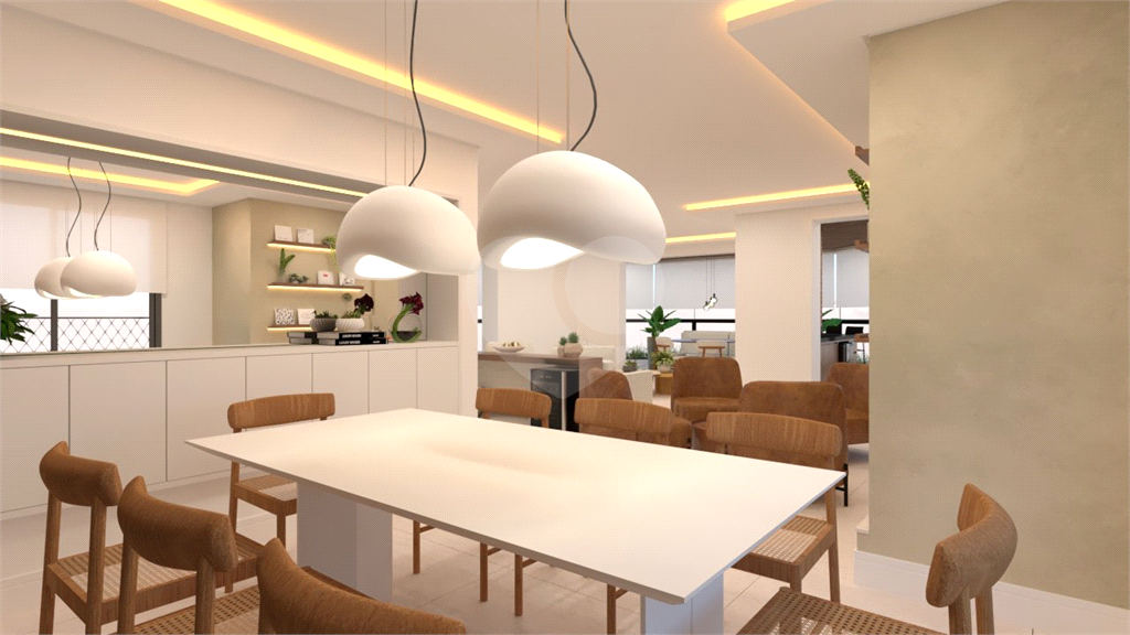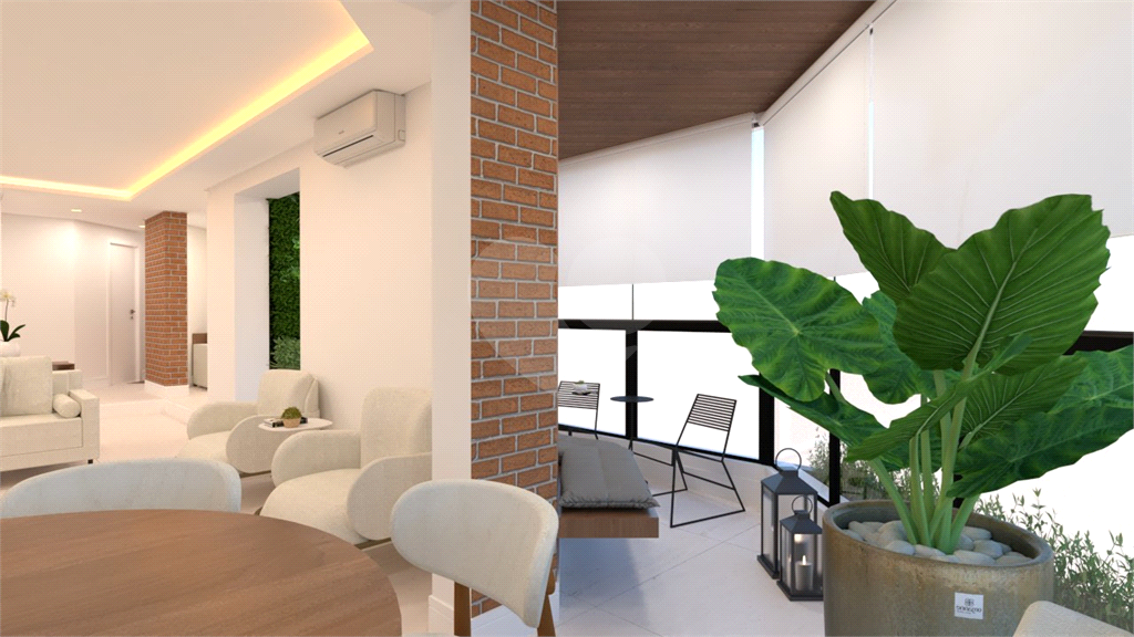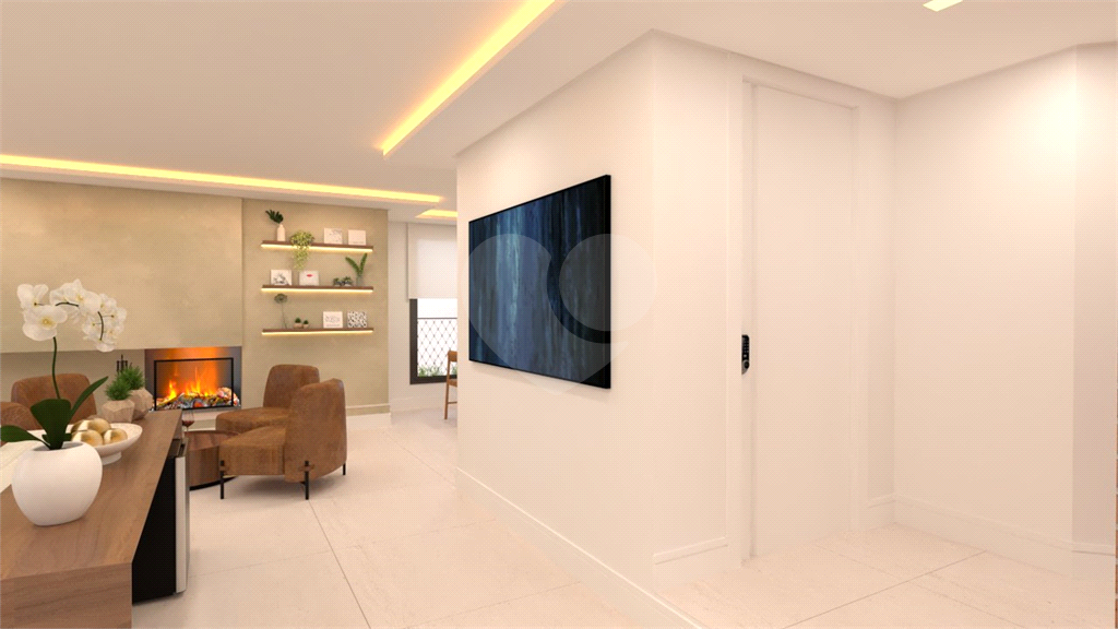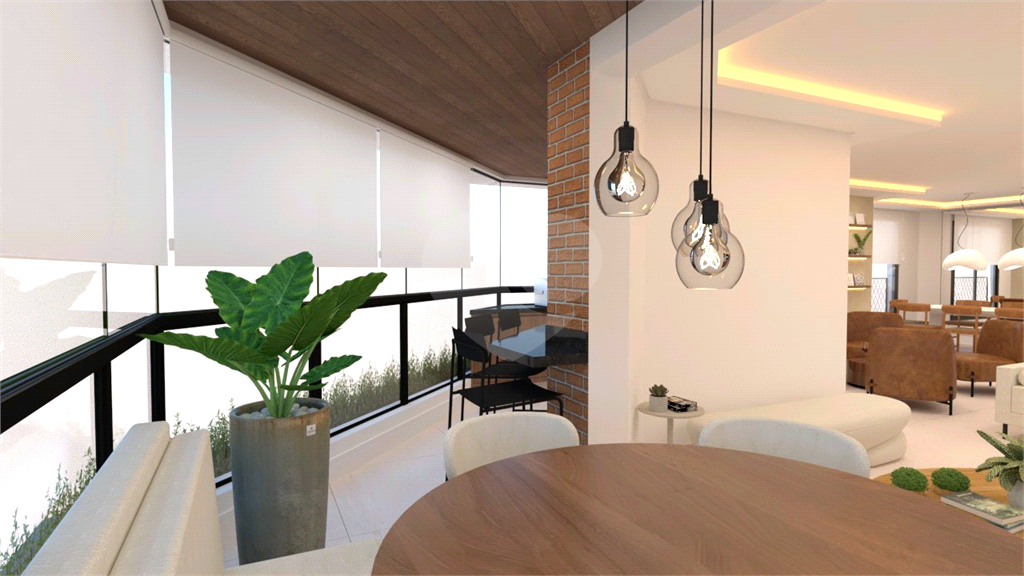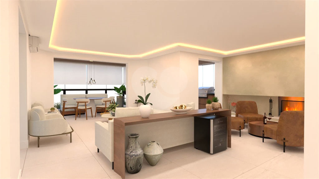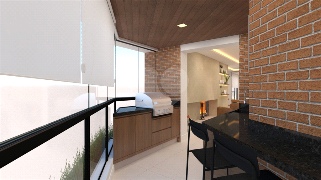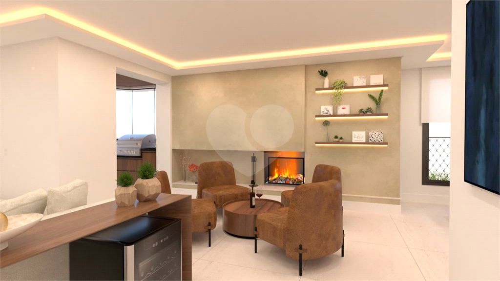 A área social é um grande destaque, com sala de estar, jantar, TV e lareira, além de lavabo. A varanda é ampla, com janelas do piso ao teto e ponto para instalação de churrasqueira elétrica.