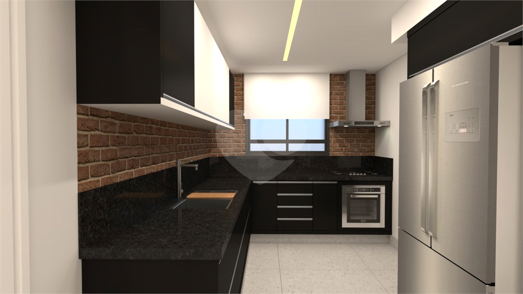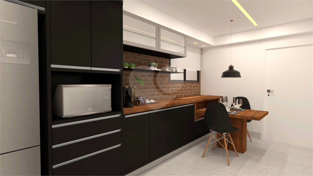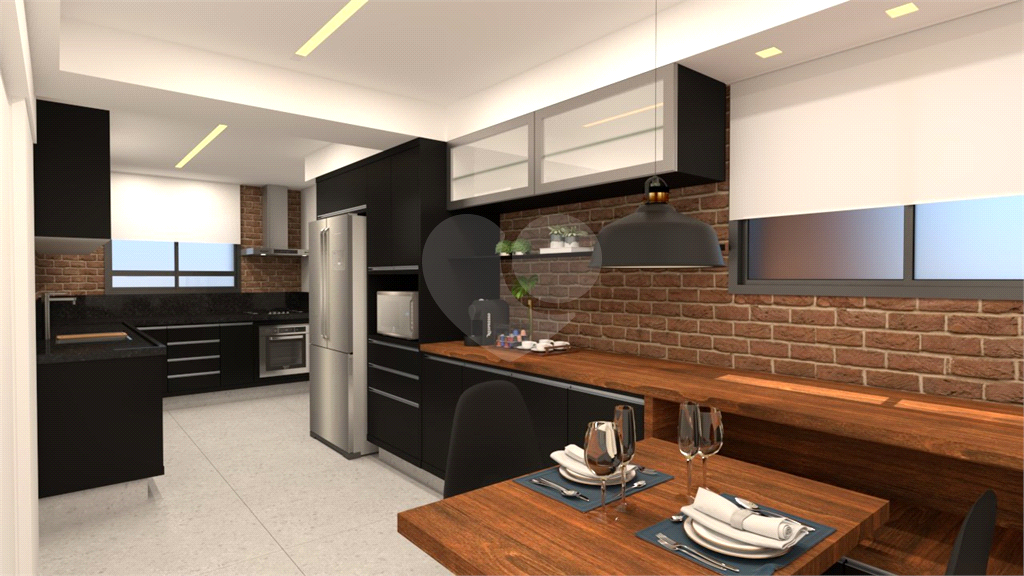 A cozinha é funcional e bem equipada, com marcenaria planejada, copa, bancada em granito preto absoluto, madeira de demolição e detalhes em pastilha Vidrotil.