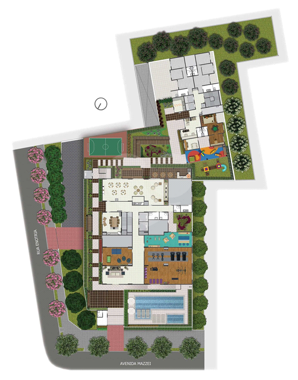 Churrasqueira com forno de pizza, quadra recreativa gramada, piscina com deck adulto e infantil, fitness, brinquedoteca, salão de jogos, salão de festas, playground.