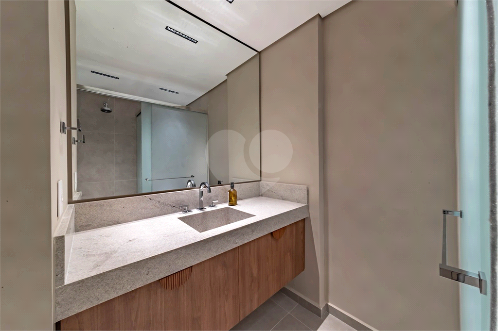 • Cuba esculpida em quartzito no lavabo, com marcenaria sob medida.