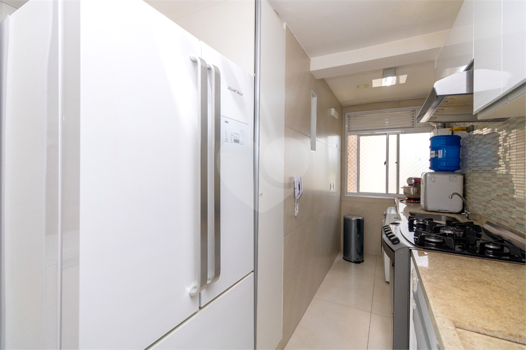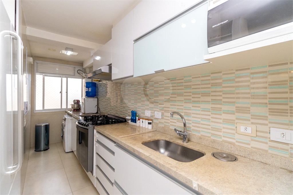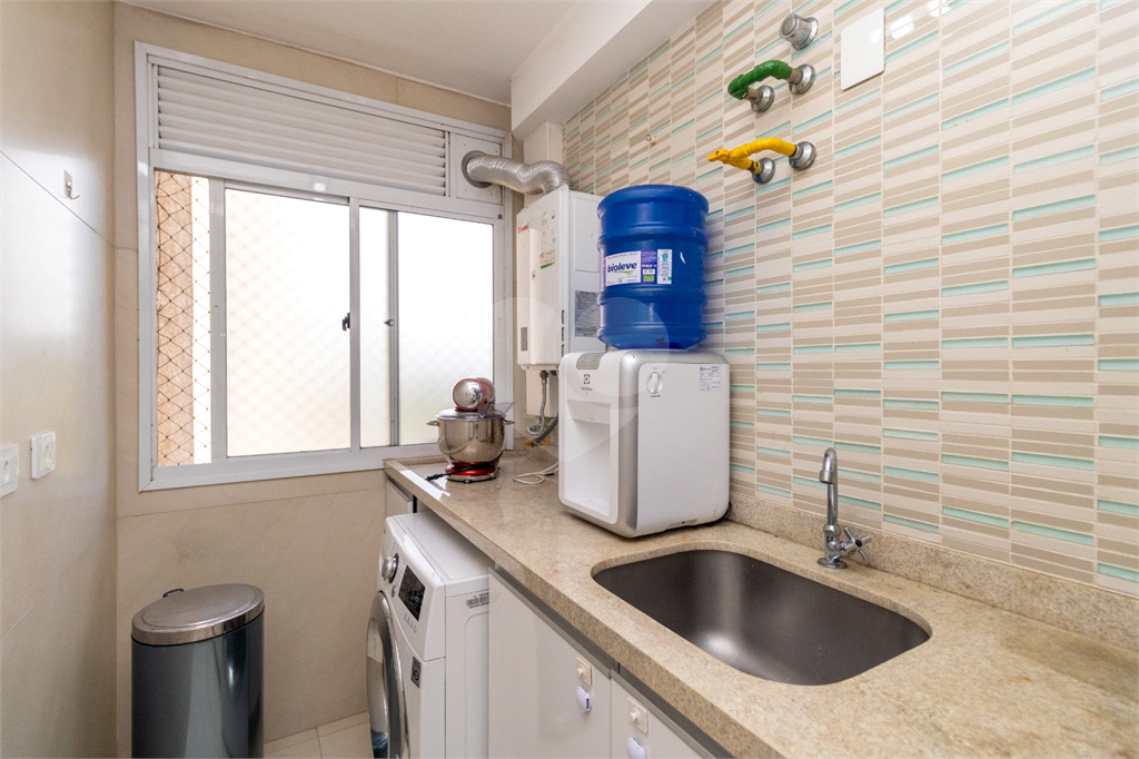 A cozinha, integrada à sala, é muito prática. Conta com armários planejados, fogão Brastemp industrial embutido e exaustor, além do acesso à lavanderia, que possui uma ampla janela trazendo iluminação e ventilação a estes ambientes.