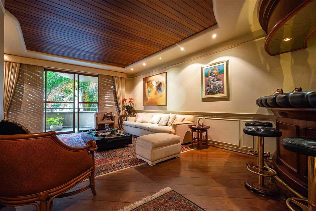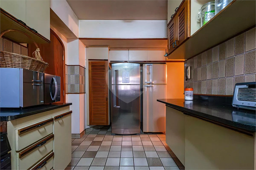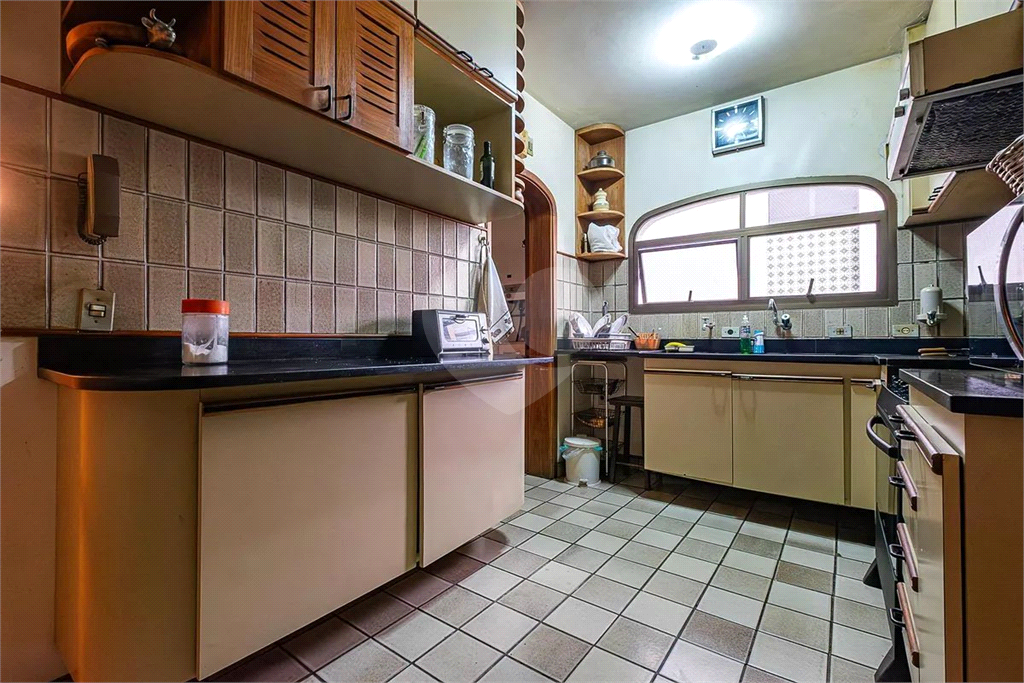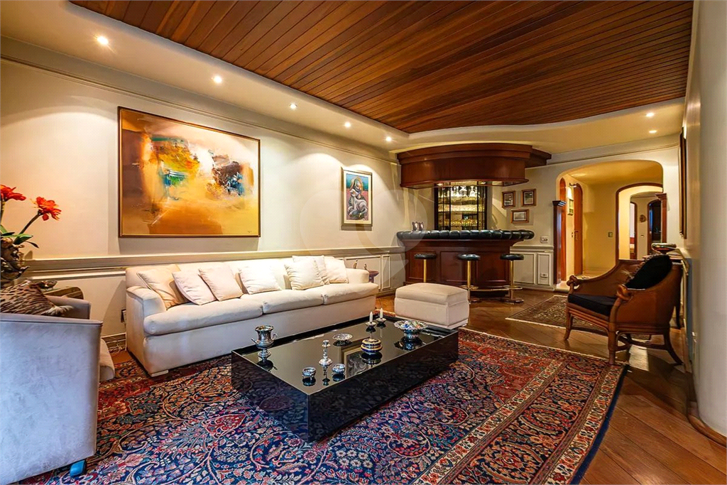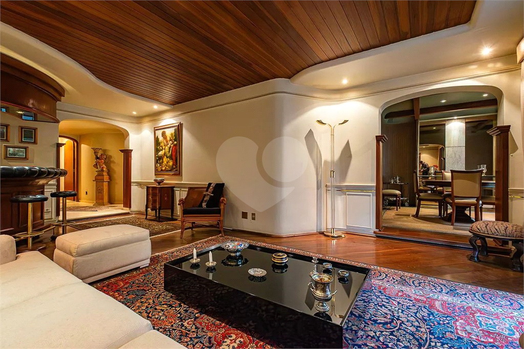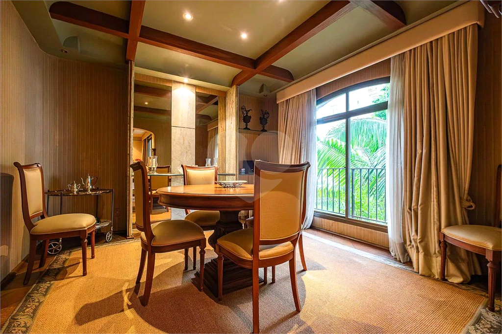 O imóvel possui duas salas: uma acolhedora sala de estar com bar e varanda, com teto de madeira rebaixado que valoriza o ambiente, e uma elegante sala de jantar integrada. Há ainda um lavabo sofisticado para receber visitas. A cozinha, totalmente planejada, conta com acesso direto à sala de jantar, além de área de serviço ventilada e dependência de empregada.