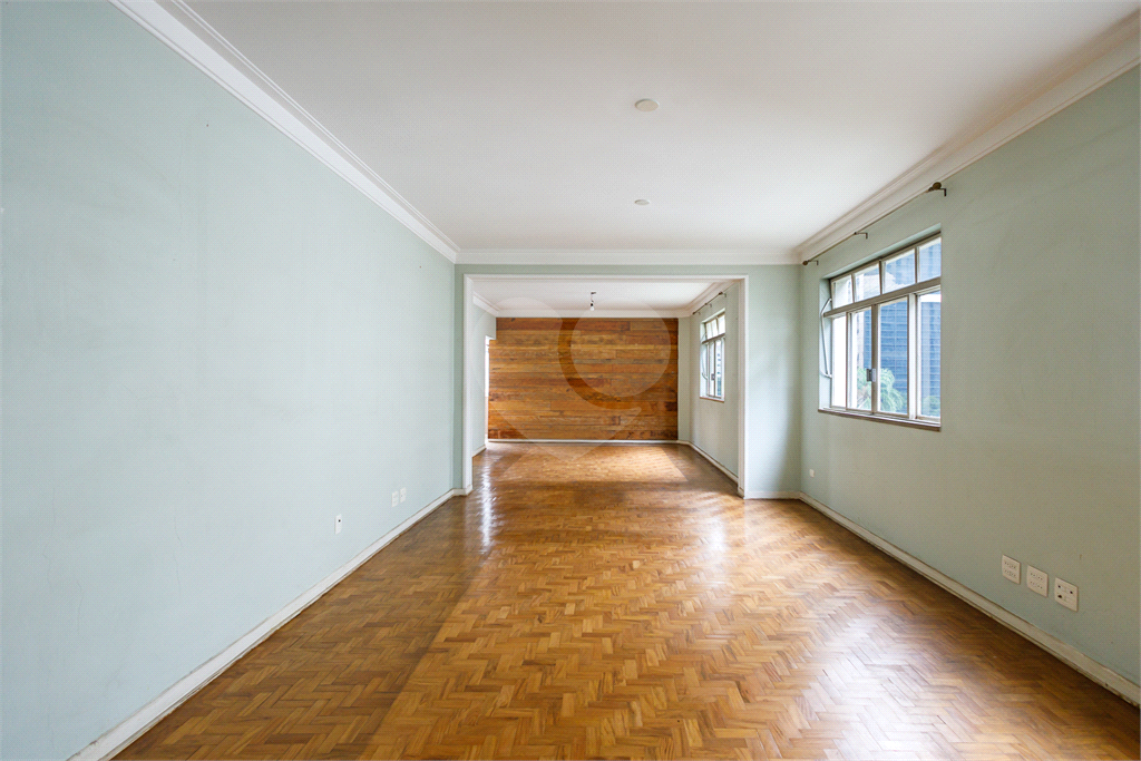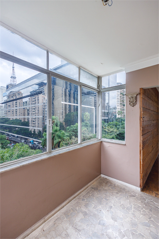 • Amplo living com janelões, piso em taco integrado a um aconchegante jardim de inverno com piso em mármore e linda vista para a copa das árvores da Rua Pamplona, muito claro e ensolarado;