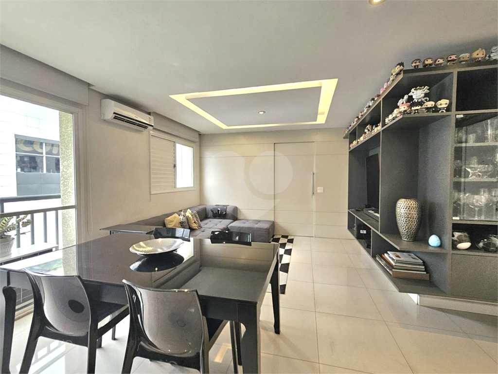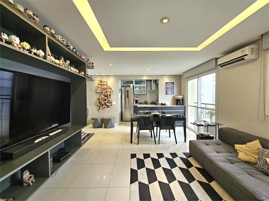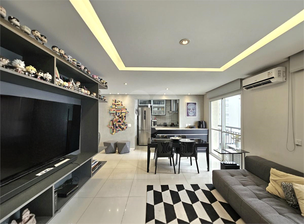 A sala integra-se à cozinha aberta, criando um espaço prático e contemporâneo para o dia a dia.
