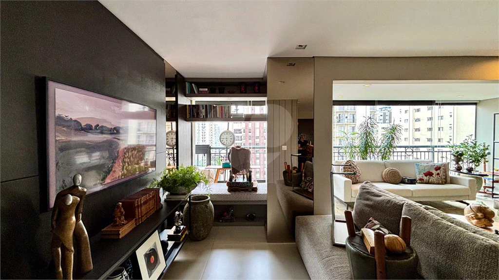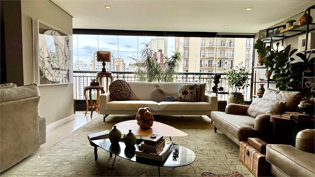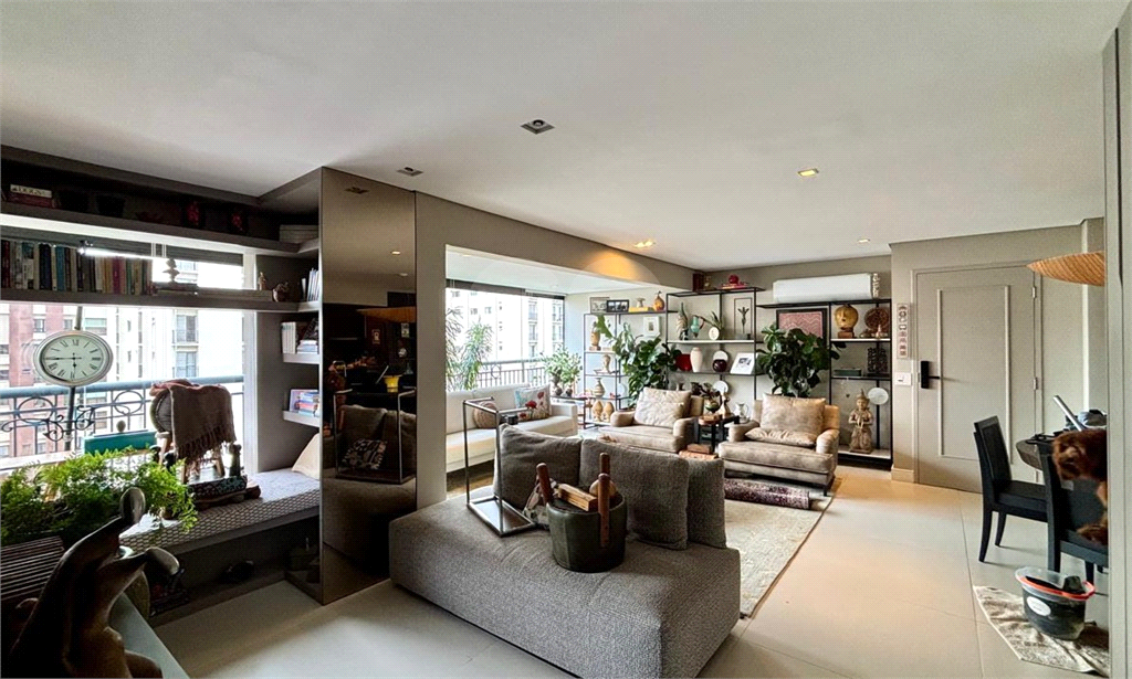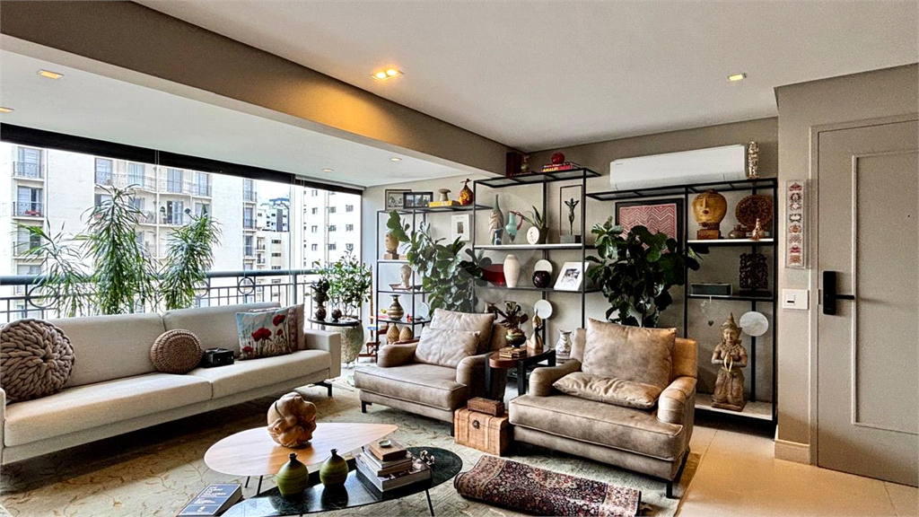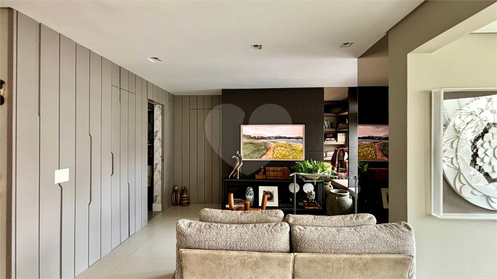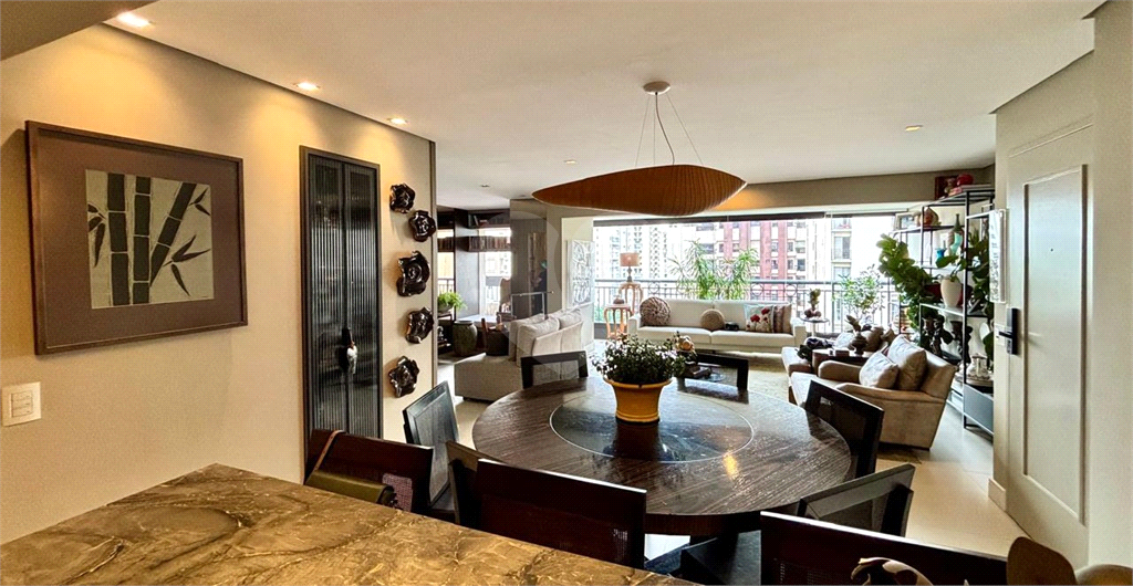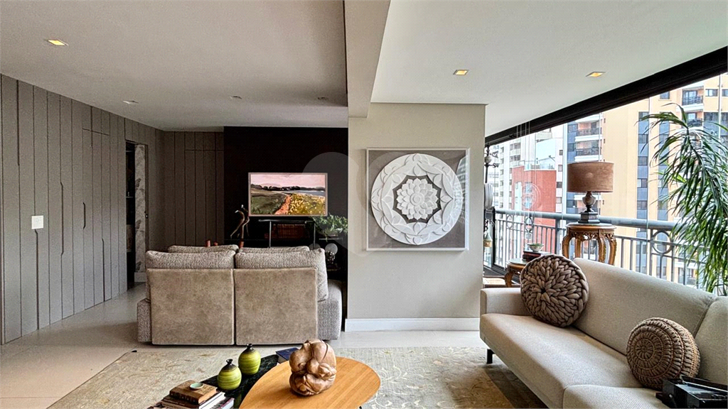 A planta original de 4 dormitórios foi reconfigurada para ampliar o living, que hoje oferece três ambientes elegantes — estar, jantar e TV — totalmente integrados à varanda, já nivelada e fechada com vidro, proporcionando vista livre e muita luminosidade.
