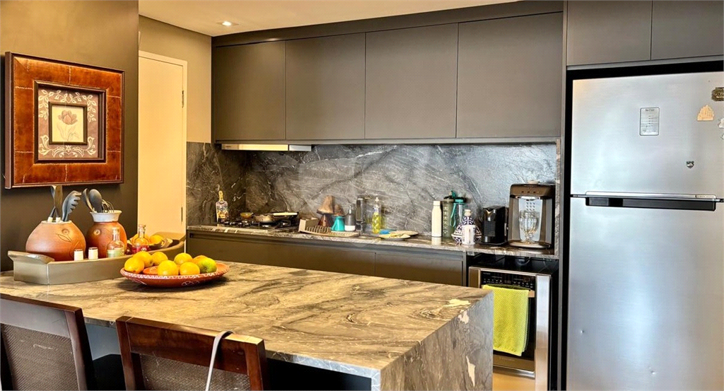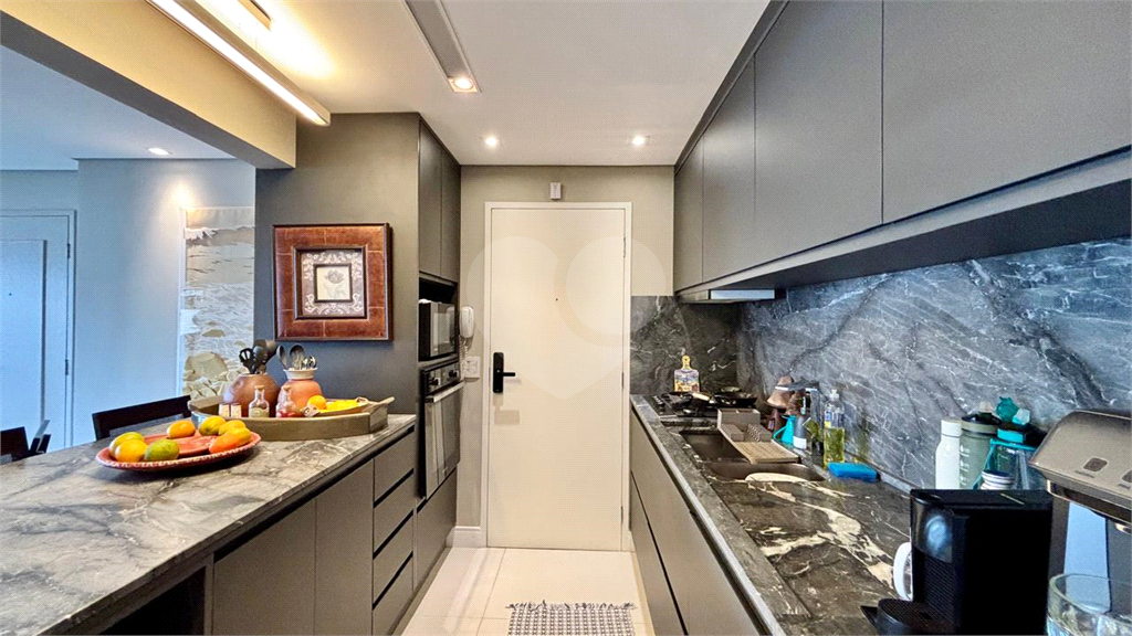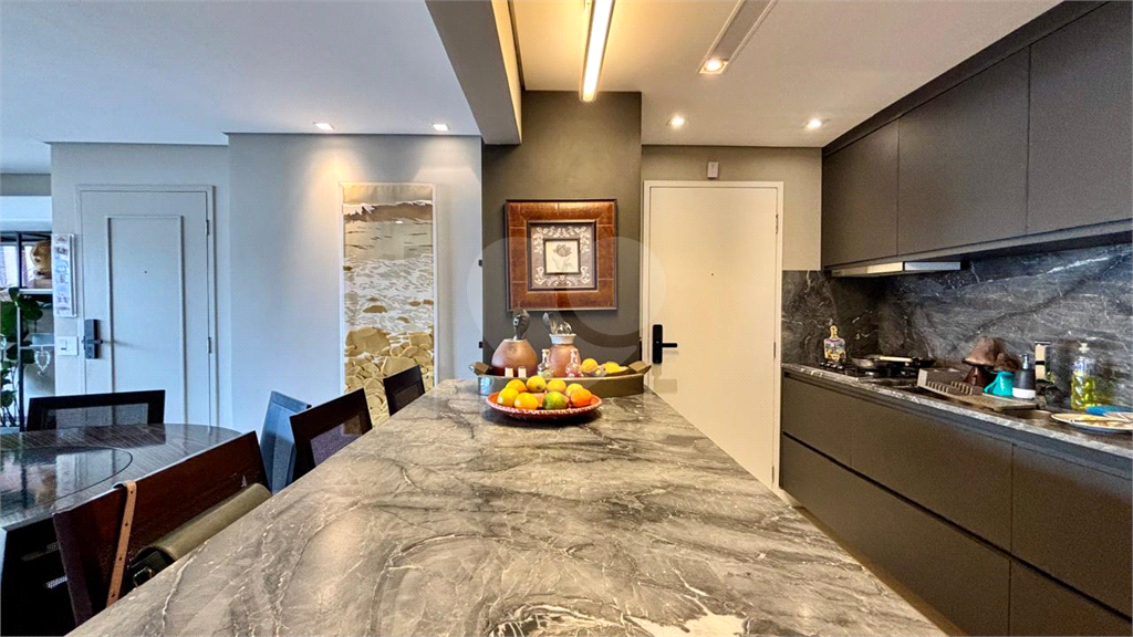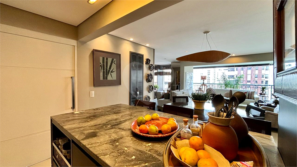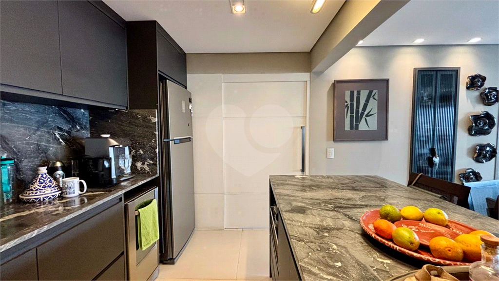 A cozinha americana é um dos grandes destaques, com balcão integrado à sala, despensa, lavanderia e banheiro de serviço.