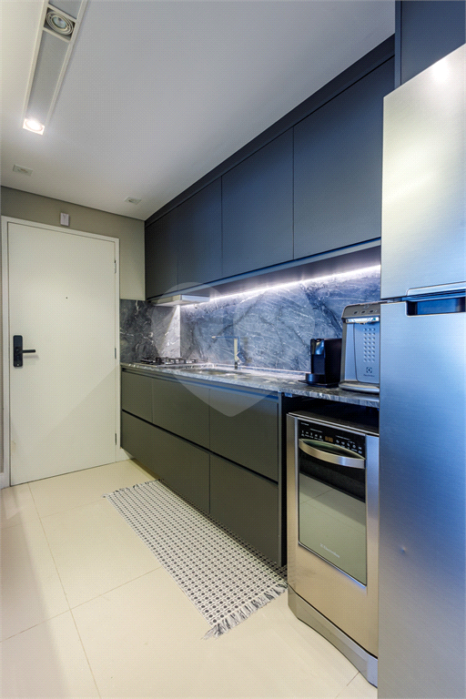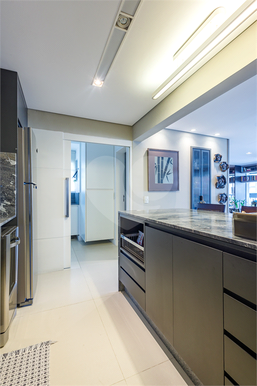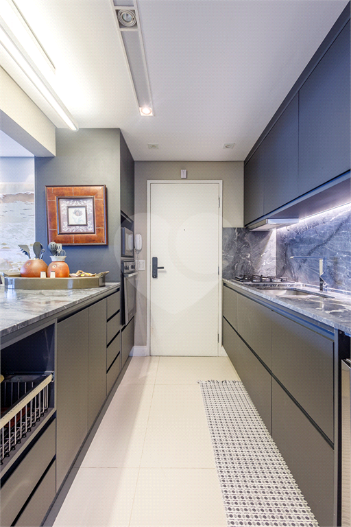 A cozinha americana é um dos grandes destaques, com balcão integrado à sala, despensa, lavanderia e banheiro de serviço.