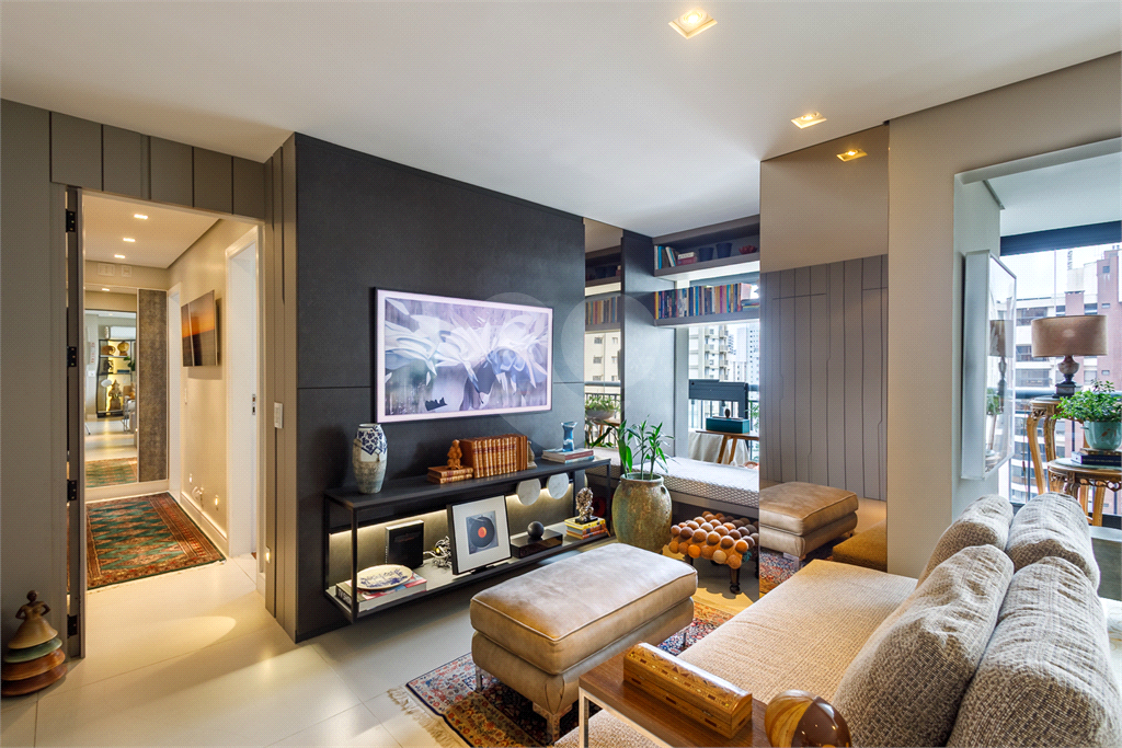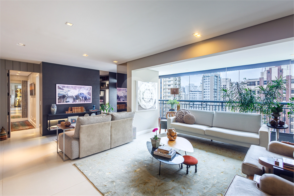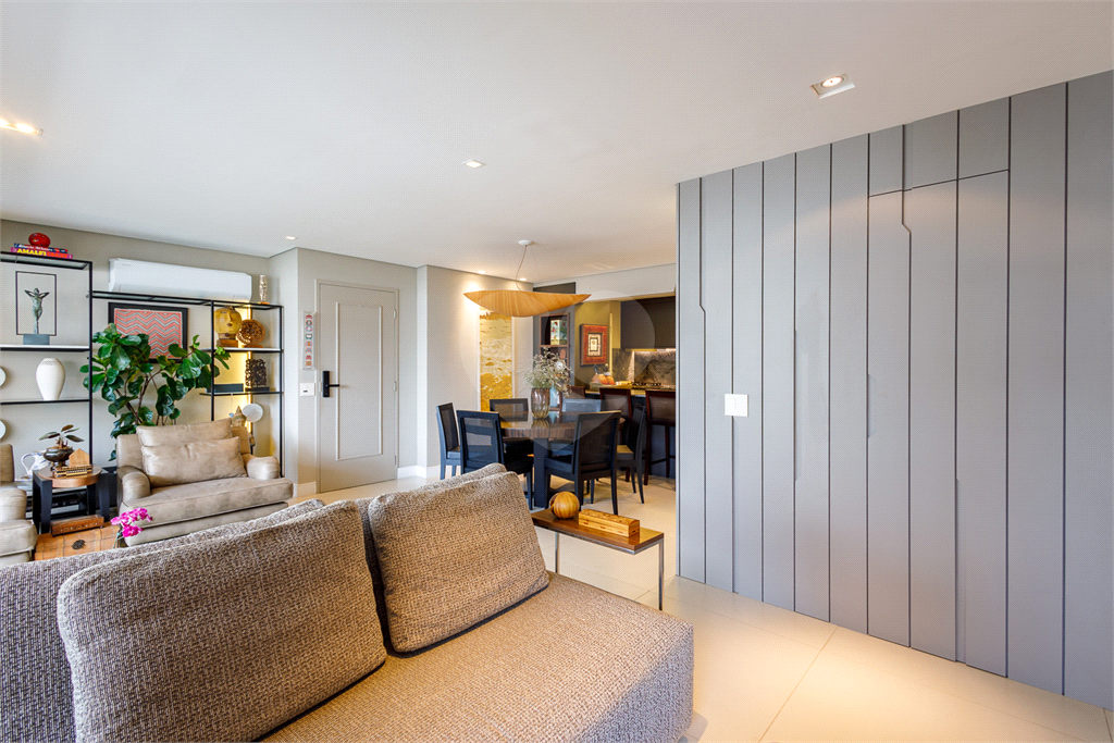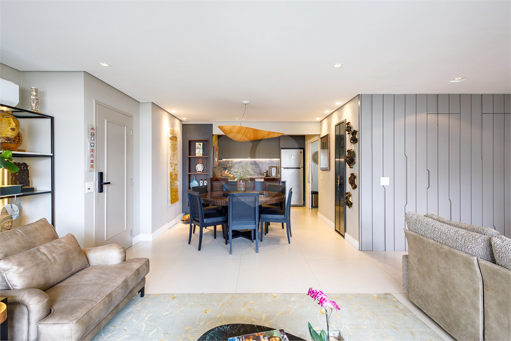 A planta original de 4 dormitórios foi reconfigurada para ampliar o living, que hoje oferece três ambientes elegantes — estar, jantar e TV — totalmente integrados à varanda, já nivelada e fechada com vidro, proporcionando vista livre e muita luminosidade.