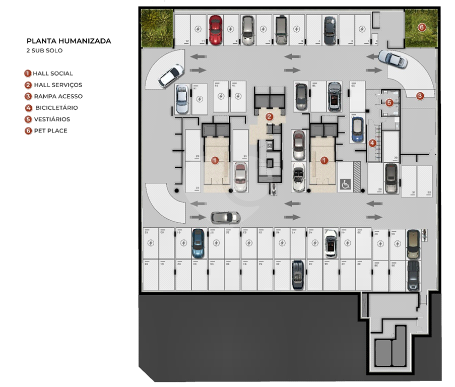 A garagem é um exemplo notável de atenção aos detalhes, com ventilação e iluminação naturais, paisagismo cuidadosamente planejado e decoração que se harmoniza perfeitamente com a estética geral do condomínio. Além disso, foi projetada para acomodar carros superesportivos, garantindo que os proprietários desfrutem de uma experiência de estacionamento única.