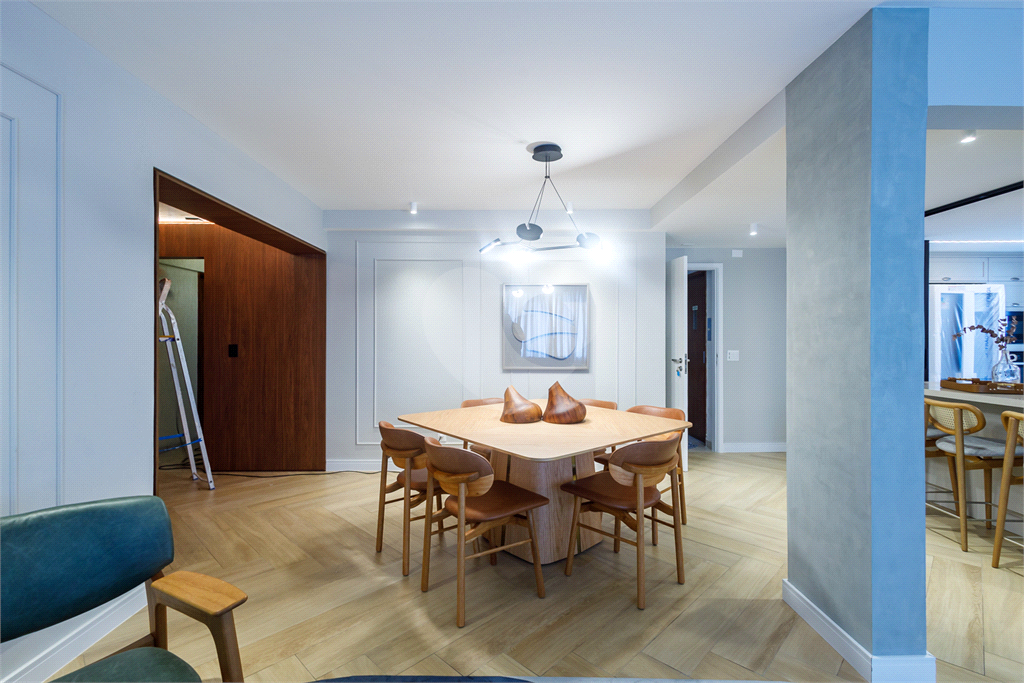 Mesa de jantar com cadeiras e pendente moderno.