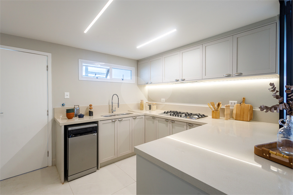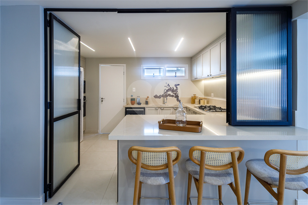 Cozinha completa, com geladeira, micro-ondas, lava-louças, coifa, cooktop e forno embutido, além de banquetas.