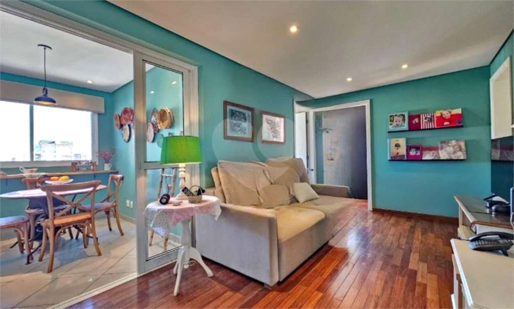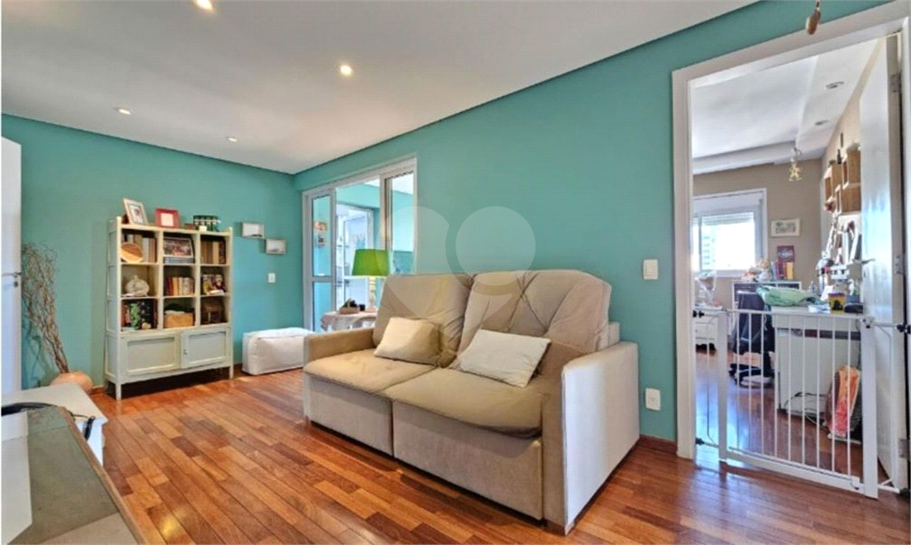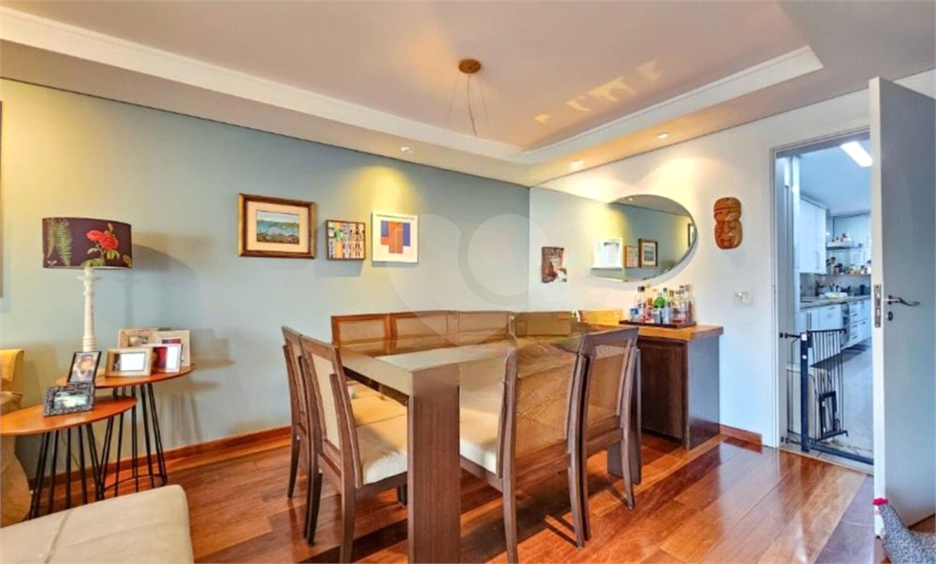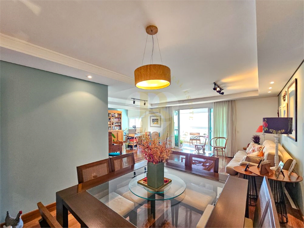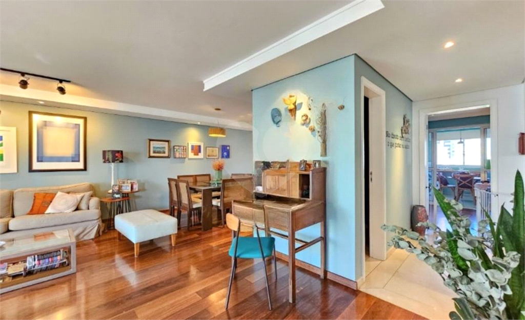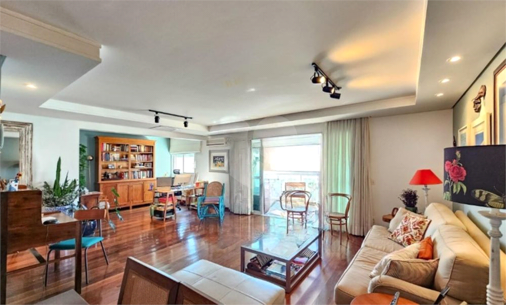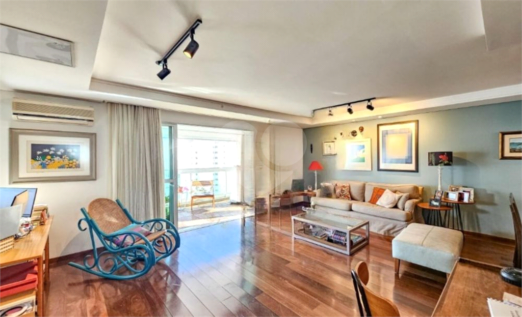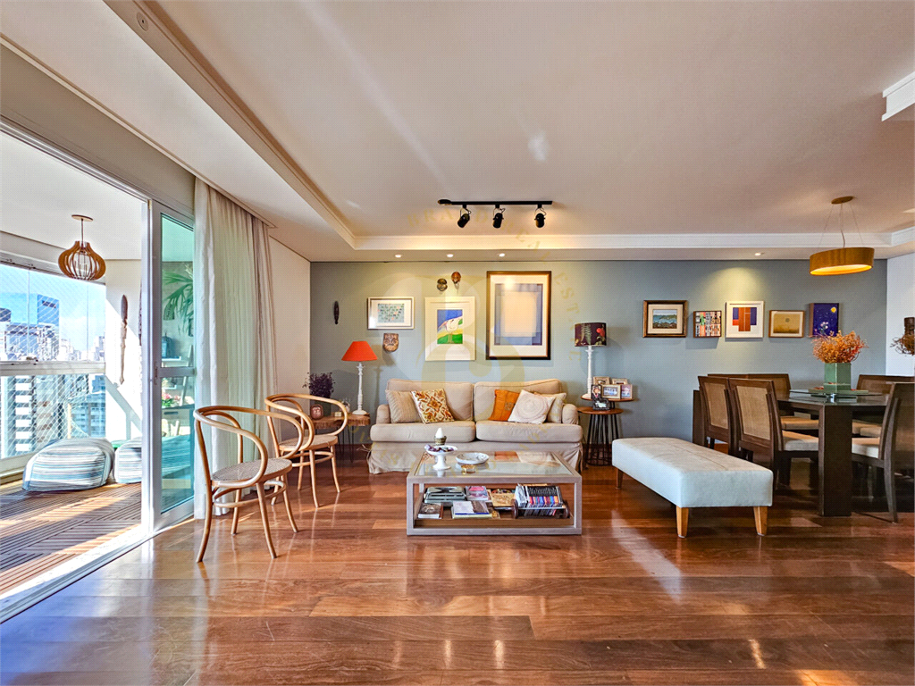 O living amplo para três ambientes se abre para uma varanda generosa, perfeita para relaxar ou receber amigos. A luminosidade natural e o piso de madeira impecável trazem aconchego e sofisticação.