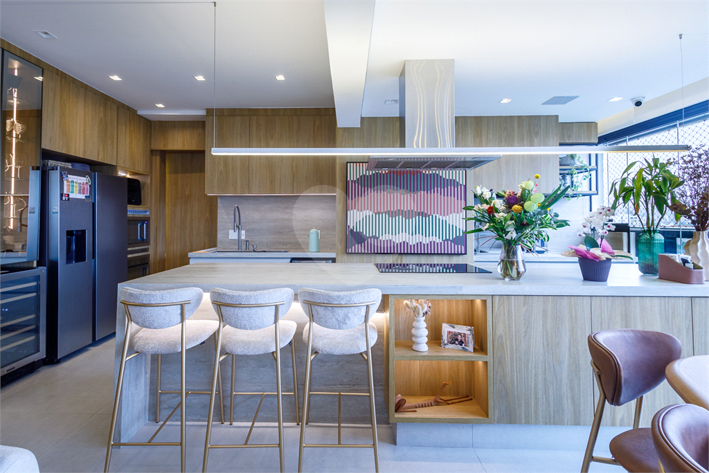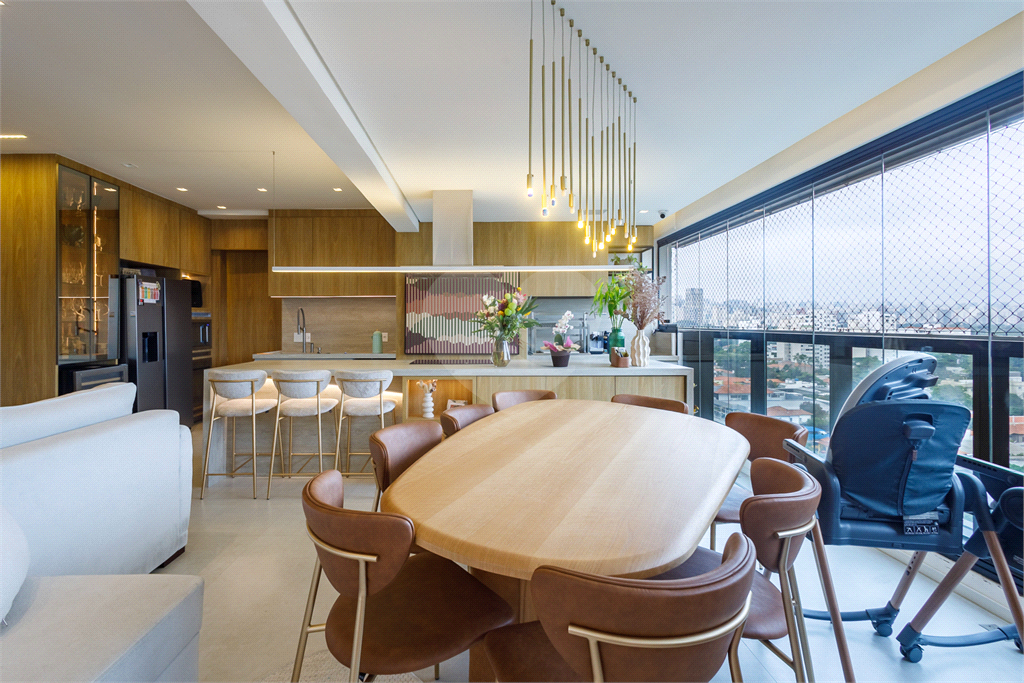 O destaque vai para a sacada envidraçada, que conecta a área gourmet com churrasqueira à cozinha e à sala de jantar, transformando o espaço em um verdadeiro ponto de encontro. A decoração impecável valoriza a sofisticação com um toque jovem e atual, equilibrando modernidade e aconchego na medida certa.