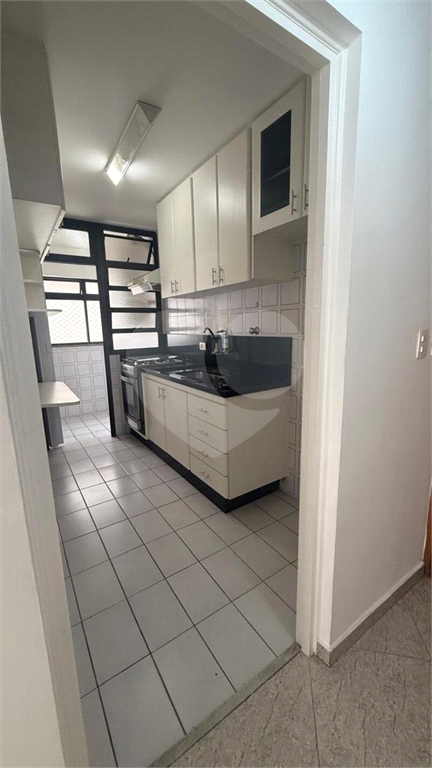 A cozinha é funcional e bem planejada, totalmente equipada com armários sob medida, fogão de quatro bocas e integração com a sala por meio de um prático passa-pratos.