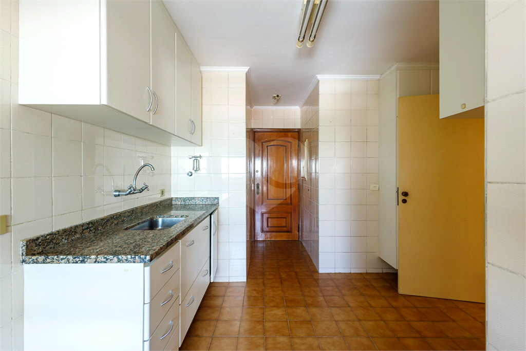 Cozinha ampla, com espaço suficiente para circulação confortável, armários planejados ou modulados, além de área de serviço adjacente.