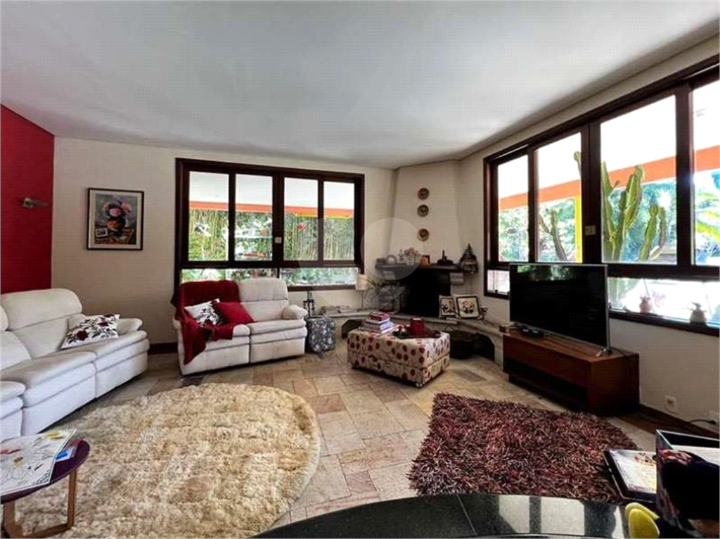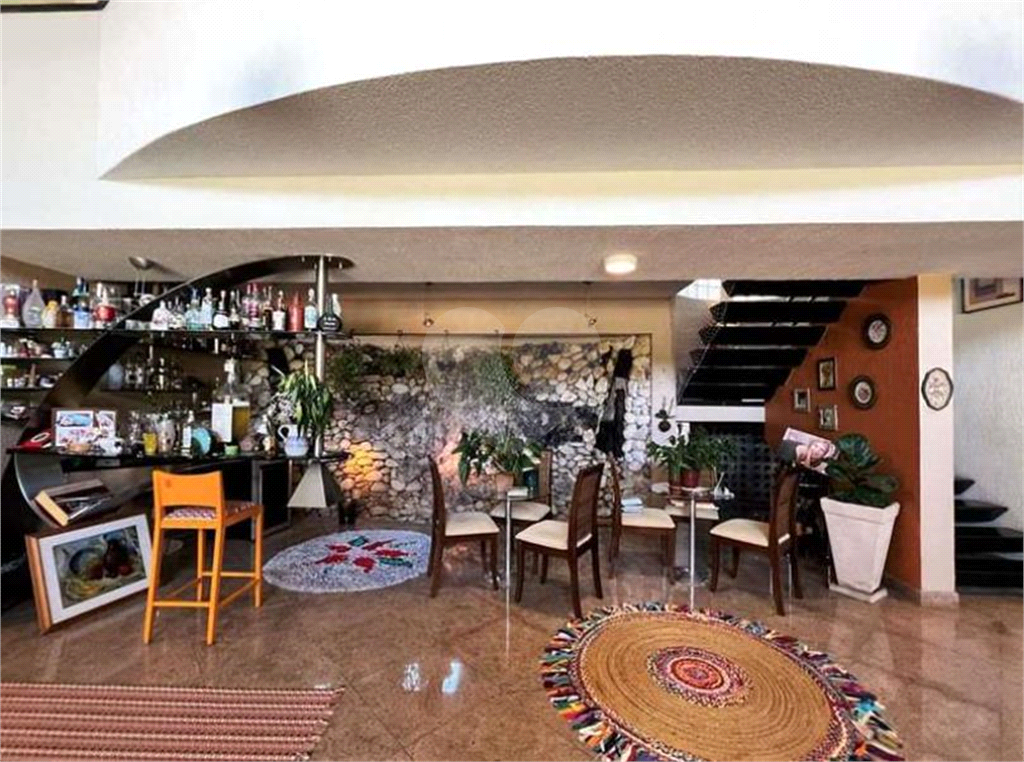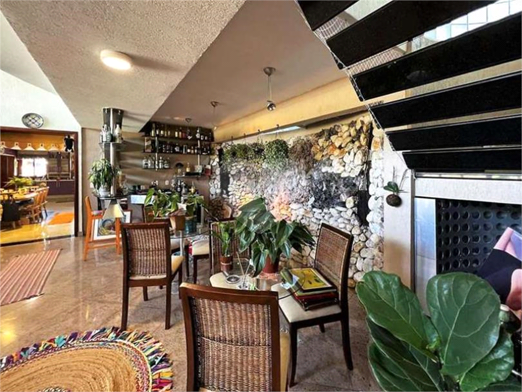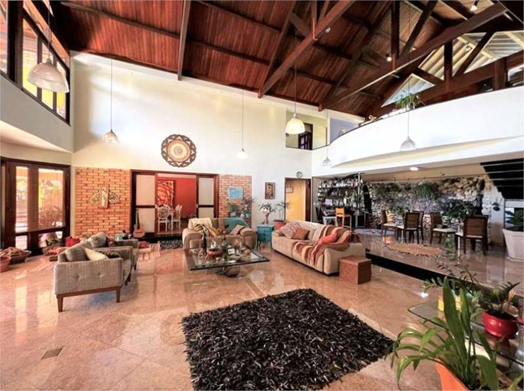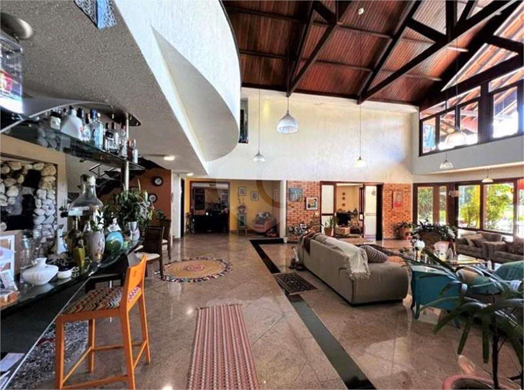 O living é outro destaque desta mansão, com espaço para até 8 ambientes integrados, sendo dois com pé direito alto e voltados para uma grande varanda com vista para a piscina, anexo gourmet e jardim. O espaço conta com estar, bar com parede de pedras e cascata, adega, lareira, jantar, almoço e quarto familiar para home theater e escritório, todos repletos de armários de qualidade.
