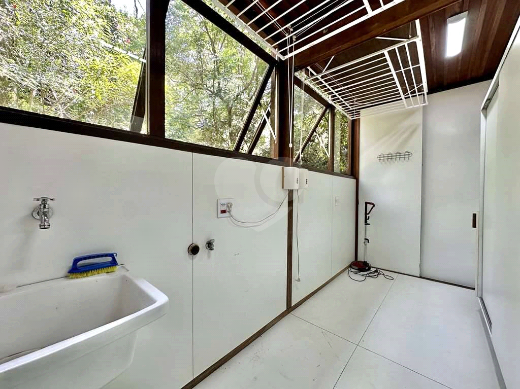 Área de serviço com portas de correr integrada à cozinha, com lavanderia planejada repleta de armários, varal elétrico, janelas basculantes e tanque.