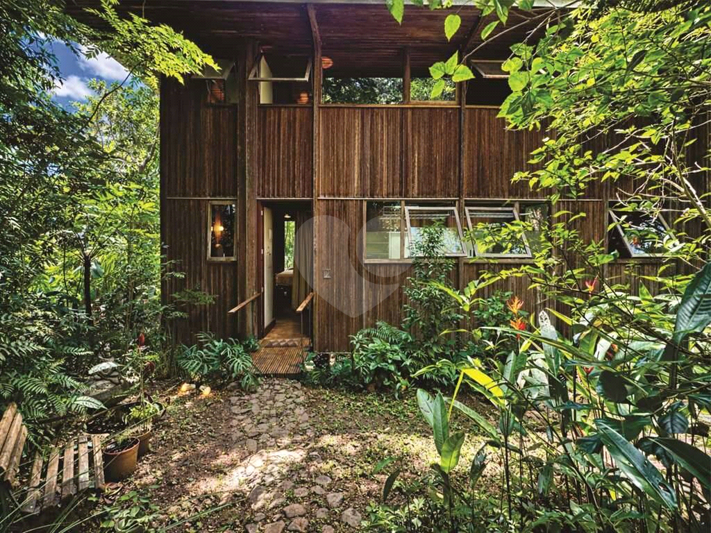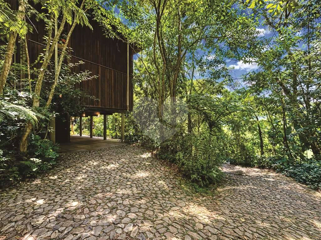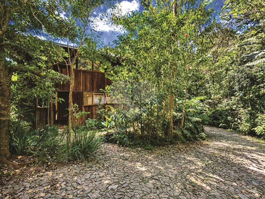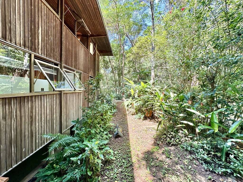 Jardim com paisagismo formado, abraçado por uma floresta tropical.