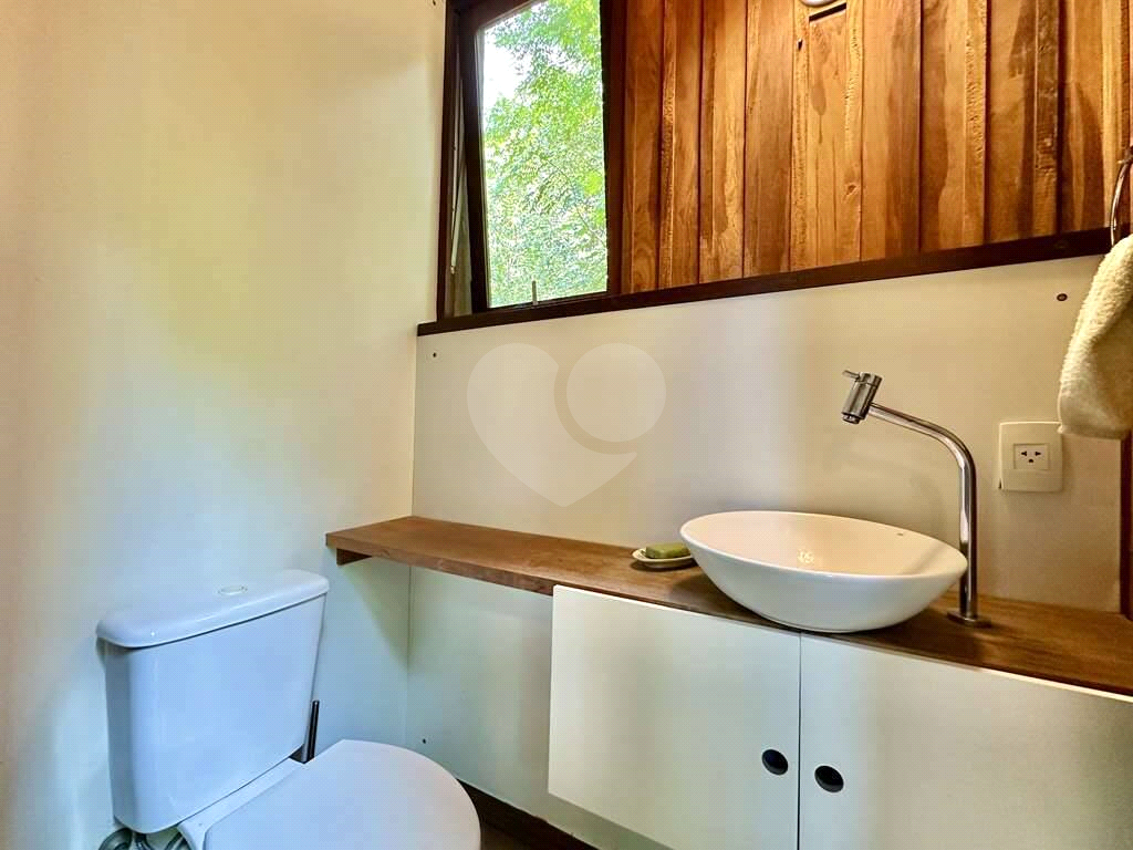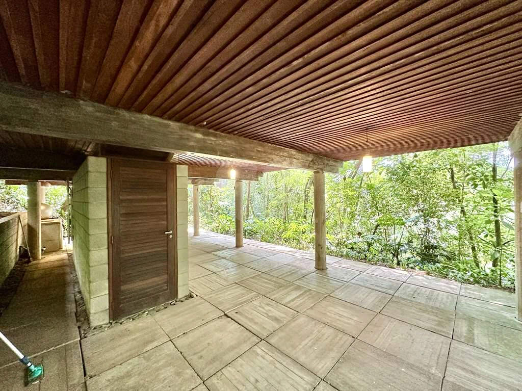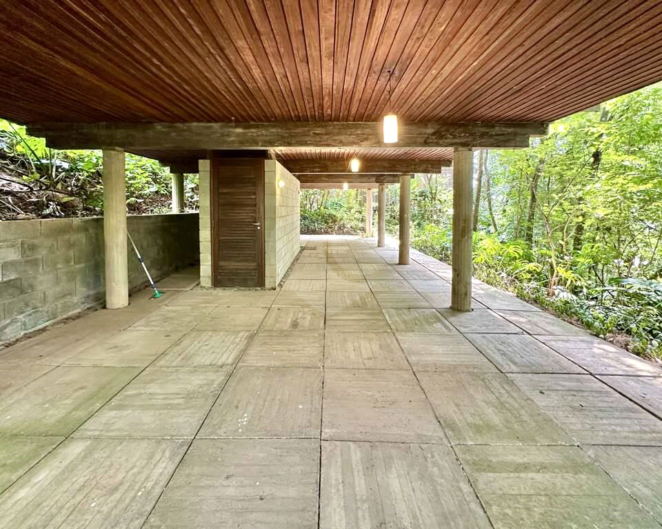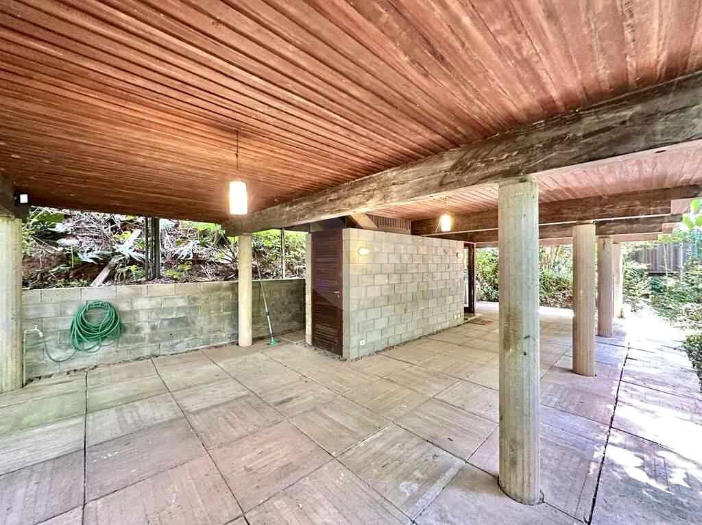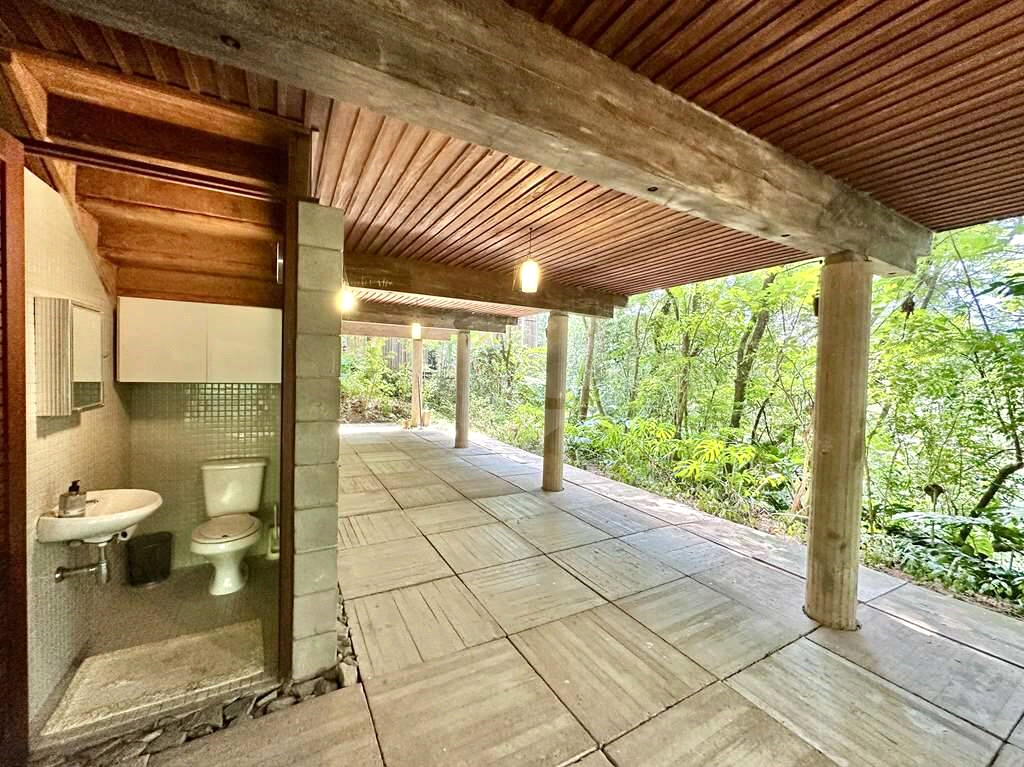Garagem integrada à natureza, com bancada de concreto, pia inox, ganchos para 2 redes, lavabo e acesso por escada interna.