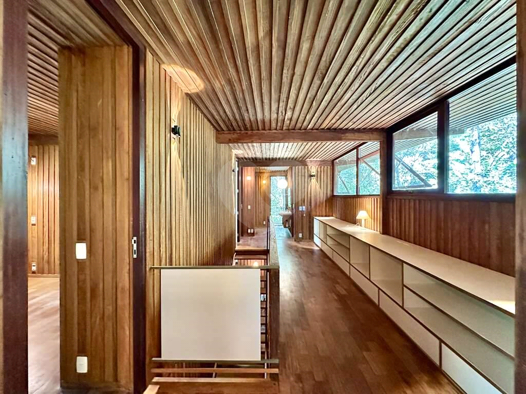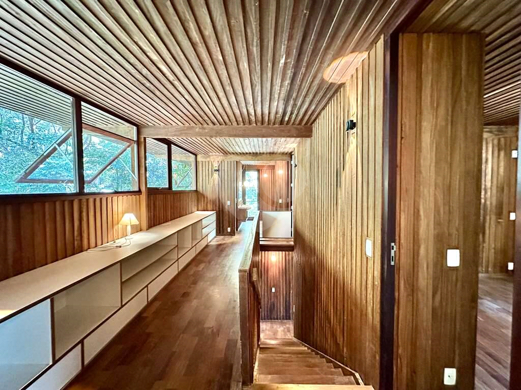 Hall íntimo envidraçado e bem iluminado naturalmente no piso superior, com bancadas e nichos para biblioteca, escritório e estudos.