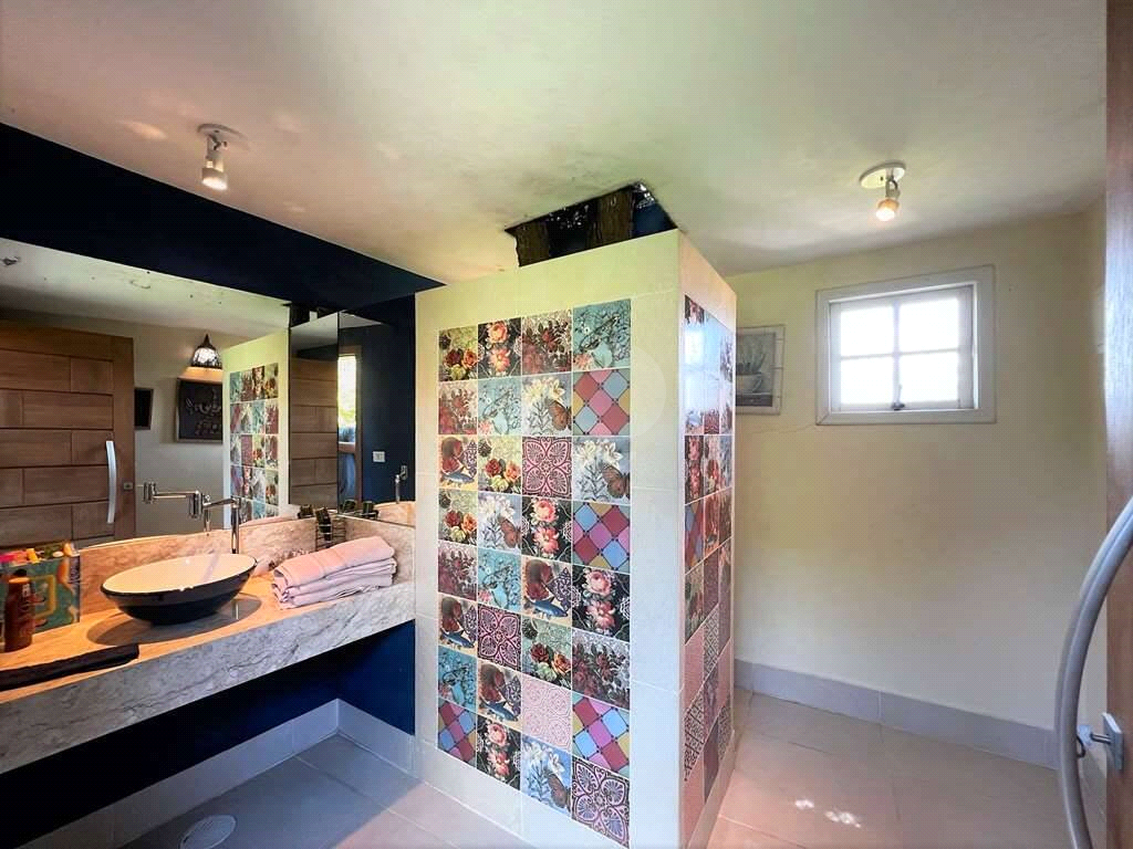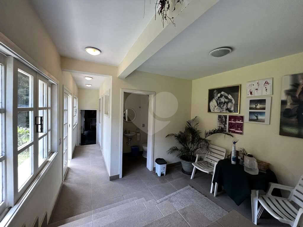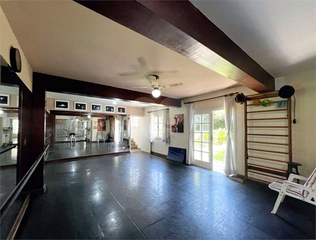 Salão multiuso voltado para um jardim lateral, com ventilador e banheiro com tampo em pedra sabão. Está sendo usado como academia de balé espelhada, com piso emborrachado. Espaço ideal também para home office, ginástica, estúdio, brinquedoteca. Com acesso interno por escada e externo pelo jardim.