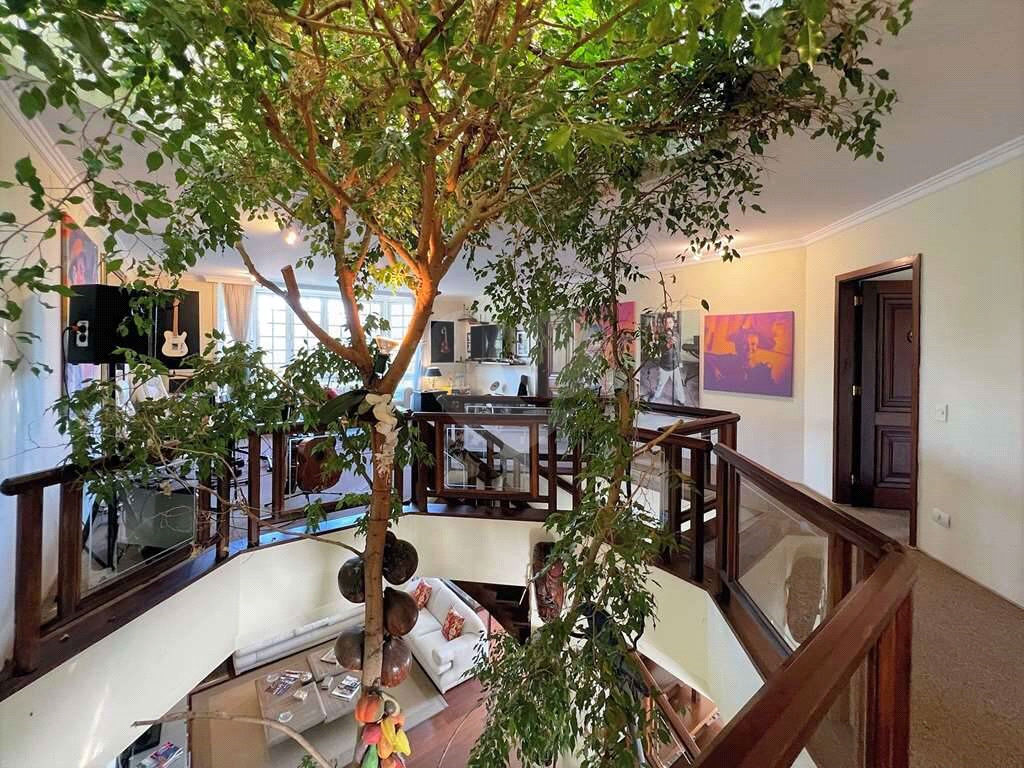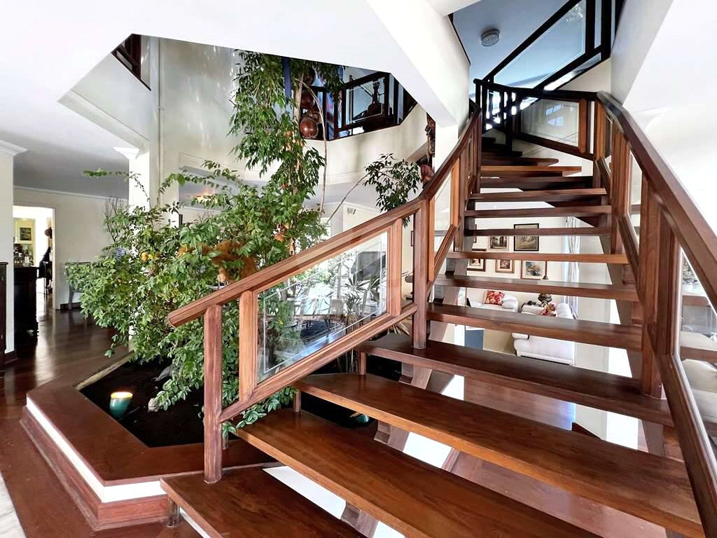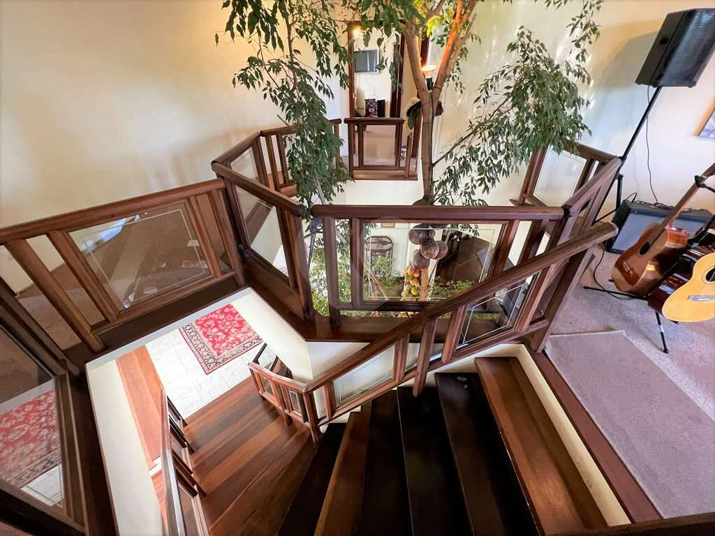 Linda escada central vasada, em madeira nobre trabalhada com vidro e um jardim interno oitavado com fícus e 3 jabuticabeiras.
