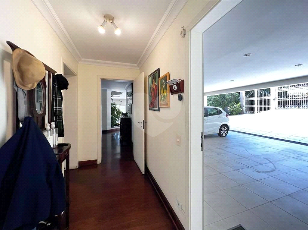 Entrada social por uma porta dupla de madeira trabalhada, com vidros bisotados e piso em mármore com molduras de madeira.