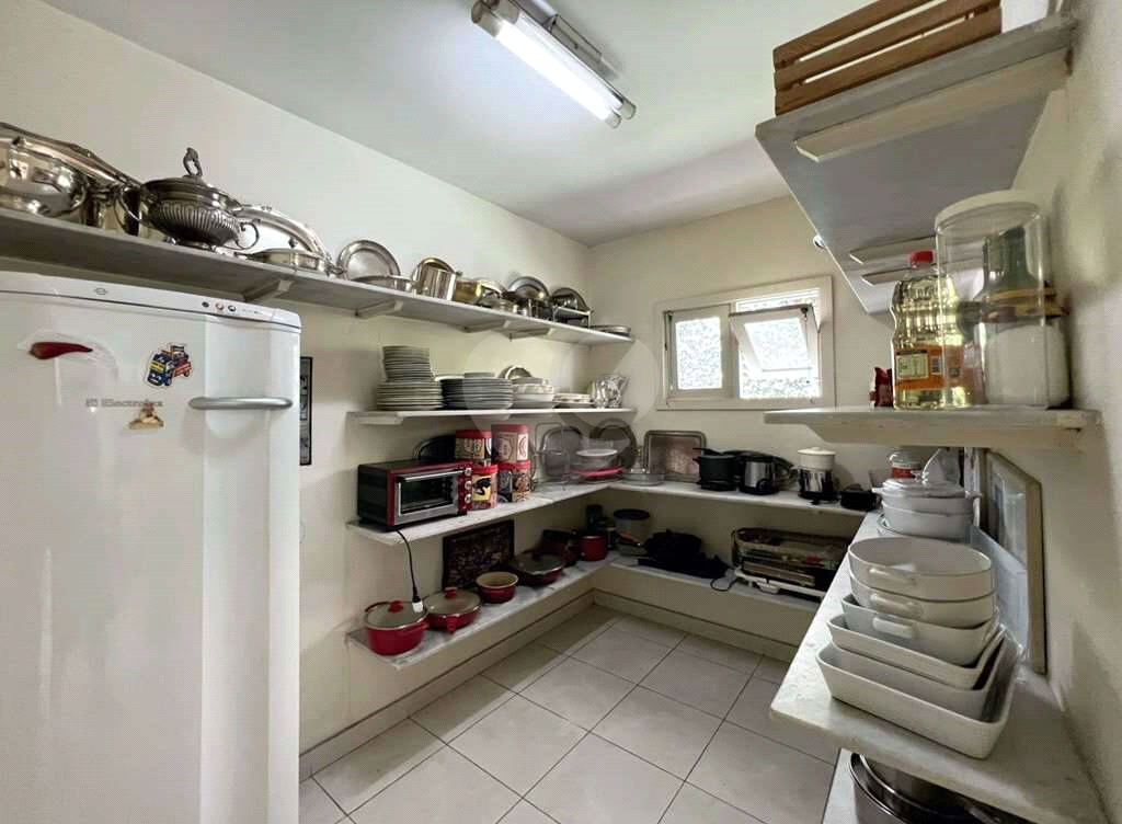 Cozinha com armários e gabinetes planejados, bancada de granito em “U” e uma grande despensa com prateleiras em mármore.