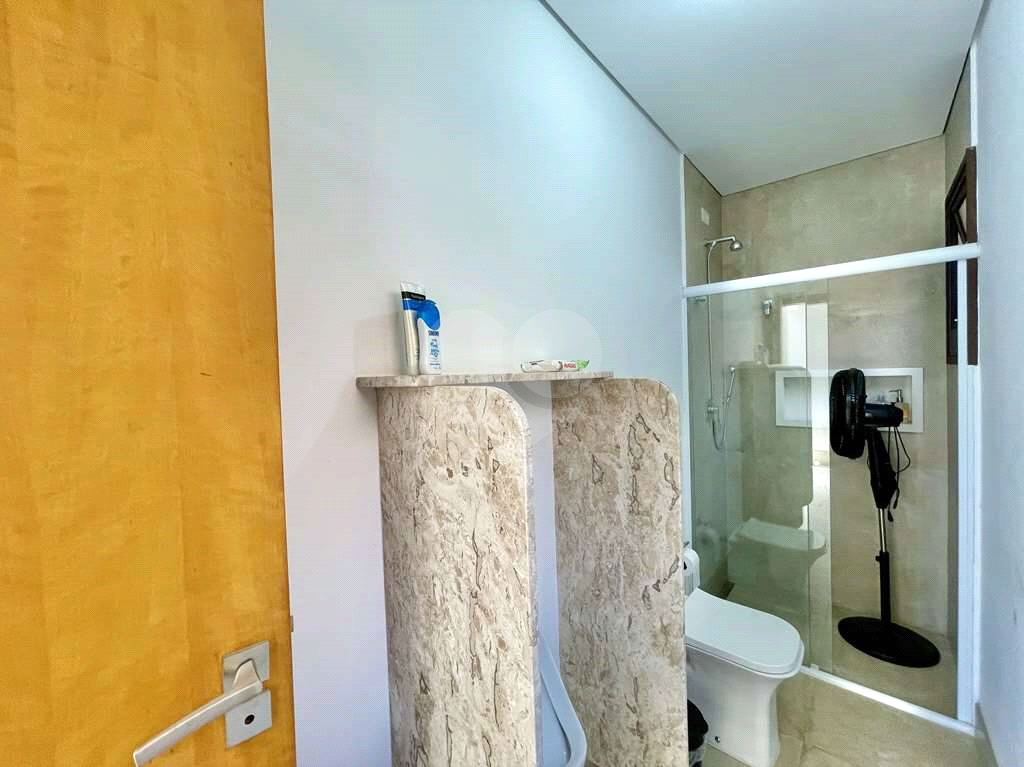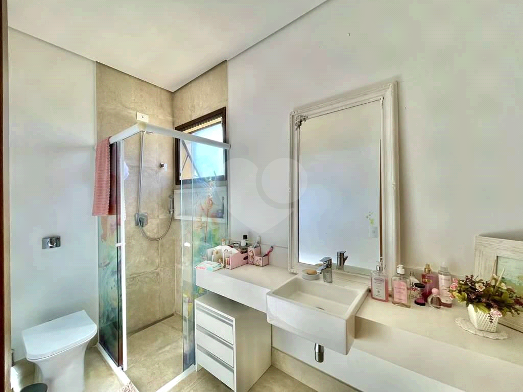 Banheiros com bancadas, box de vidro e nichos. Sendo a master uma sala de banho envidraçada “panorâmica” com teto de vidro, 2 Cubas, 2 vasos, 2 chuveiros e preparada para instalação de sauna úmida, hidro, TV e áudio.