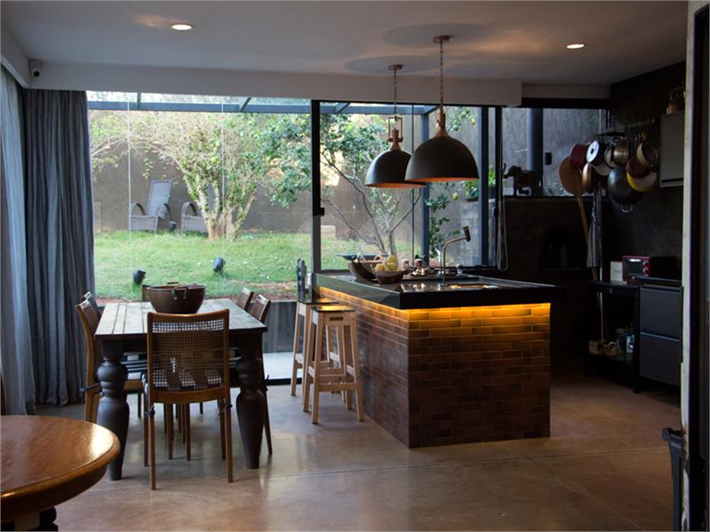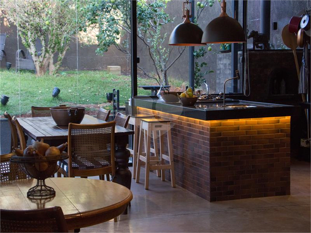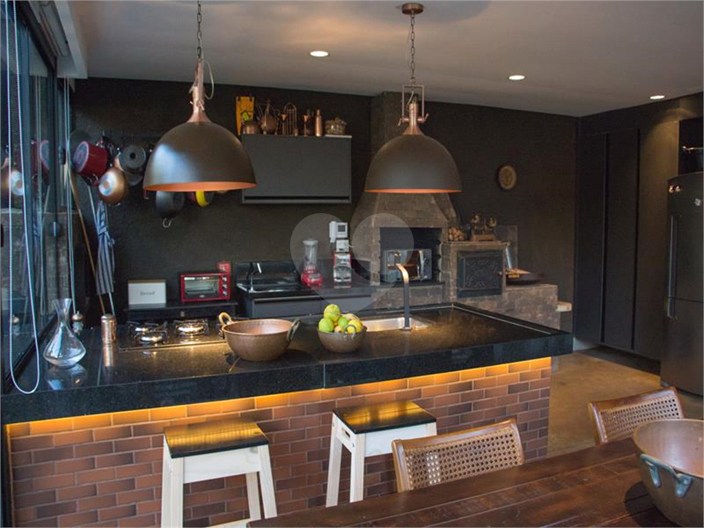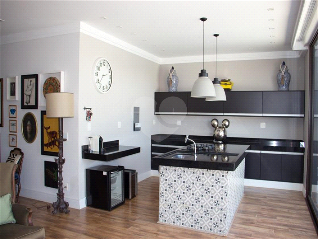 O living possui uma cozinha com ilha, bancada de ladrilho hidráulico, tampo em granito preto e armários planejados no living principal.