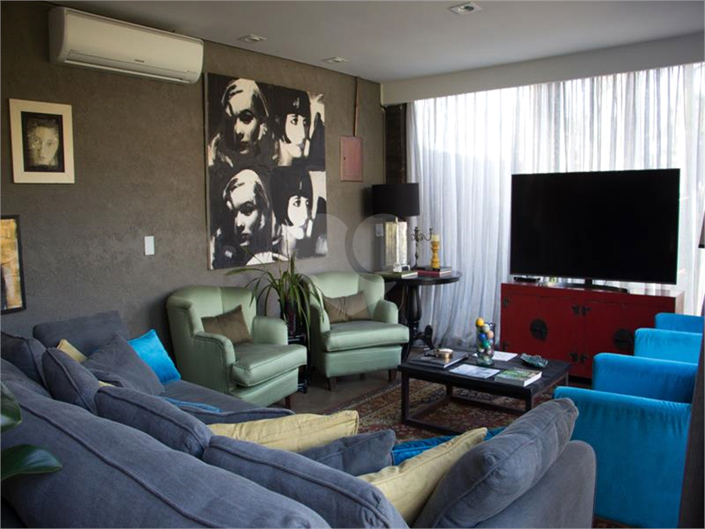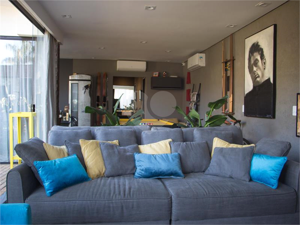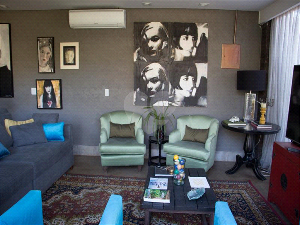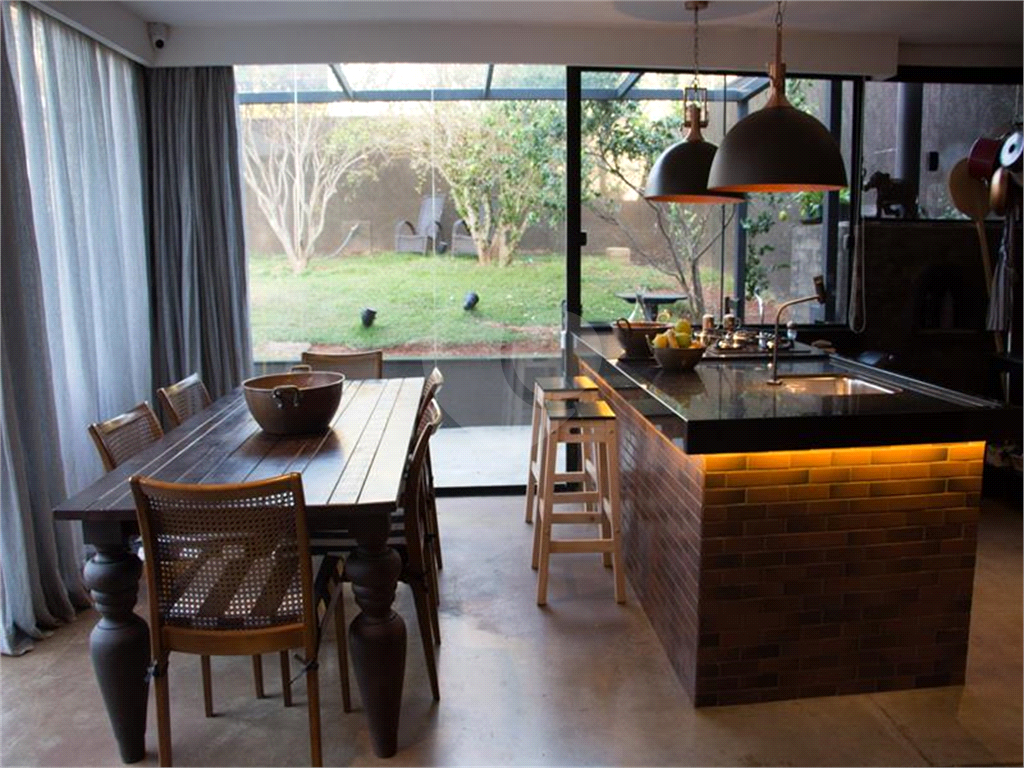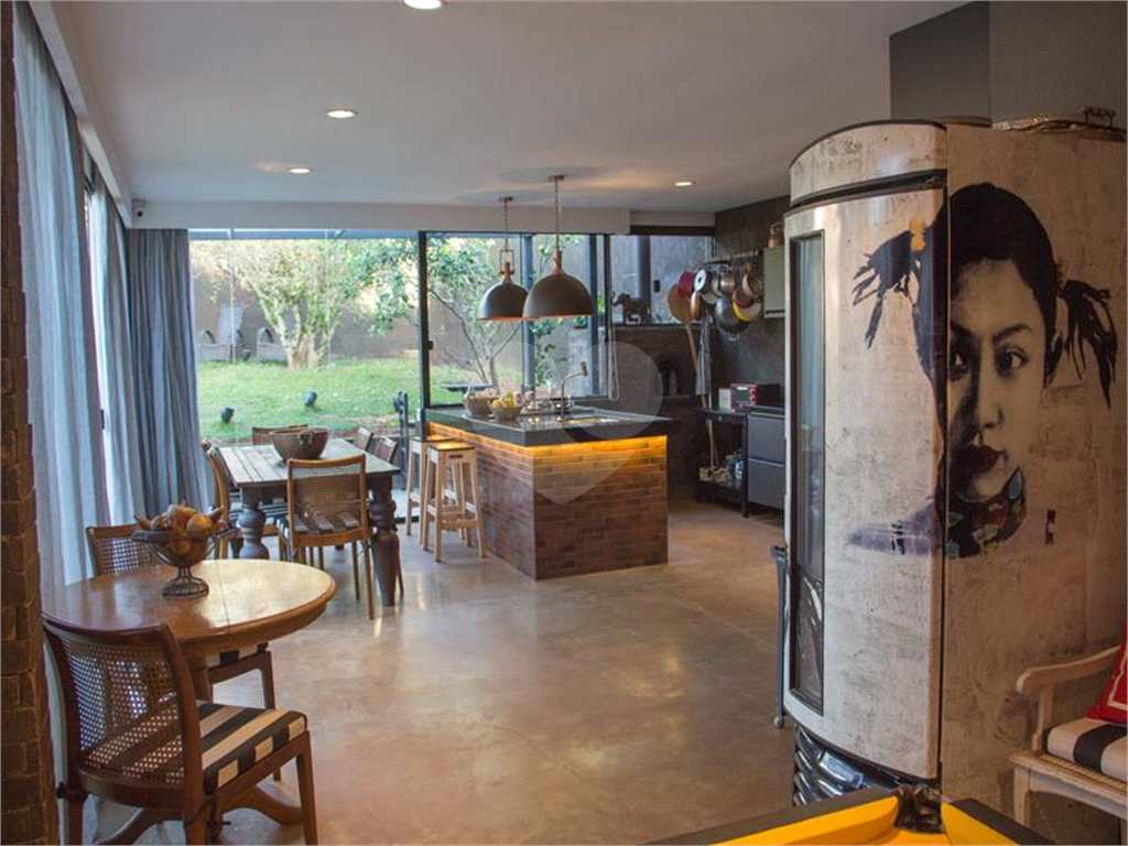 O living possui uma cozinha com ilha, bancada de ladrilho hidráulico, tampo em granito preto e armários planejados no living principal.