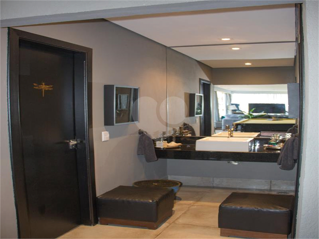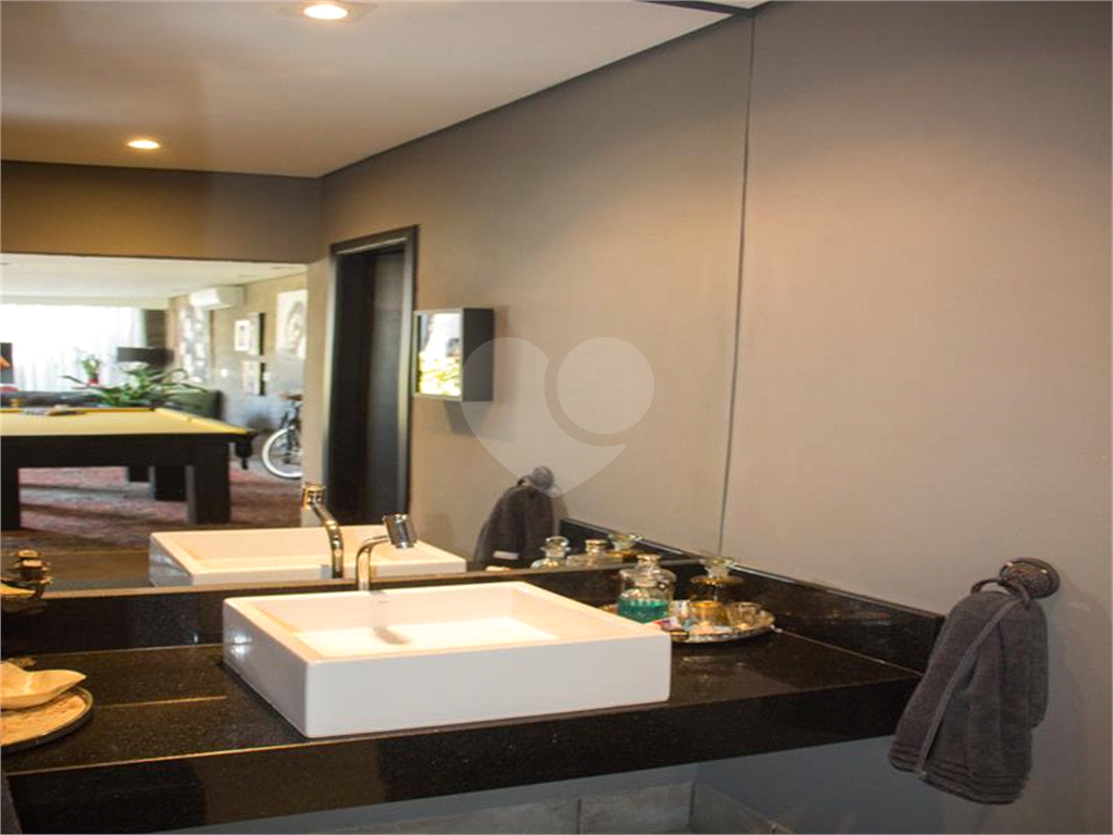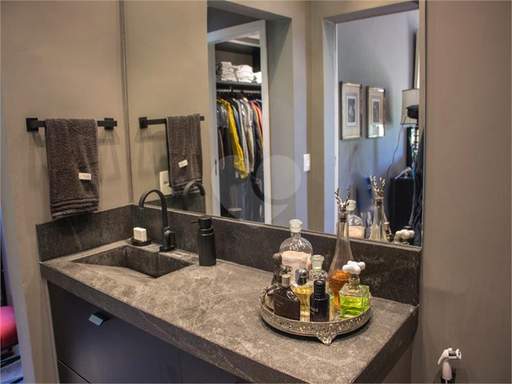 bancada em ilha, tampo de granito preto, 2 banheiros, armários