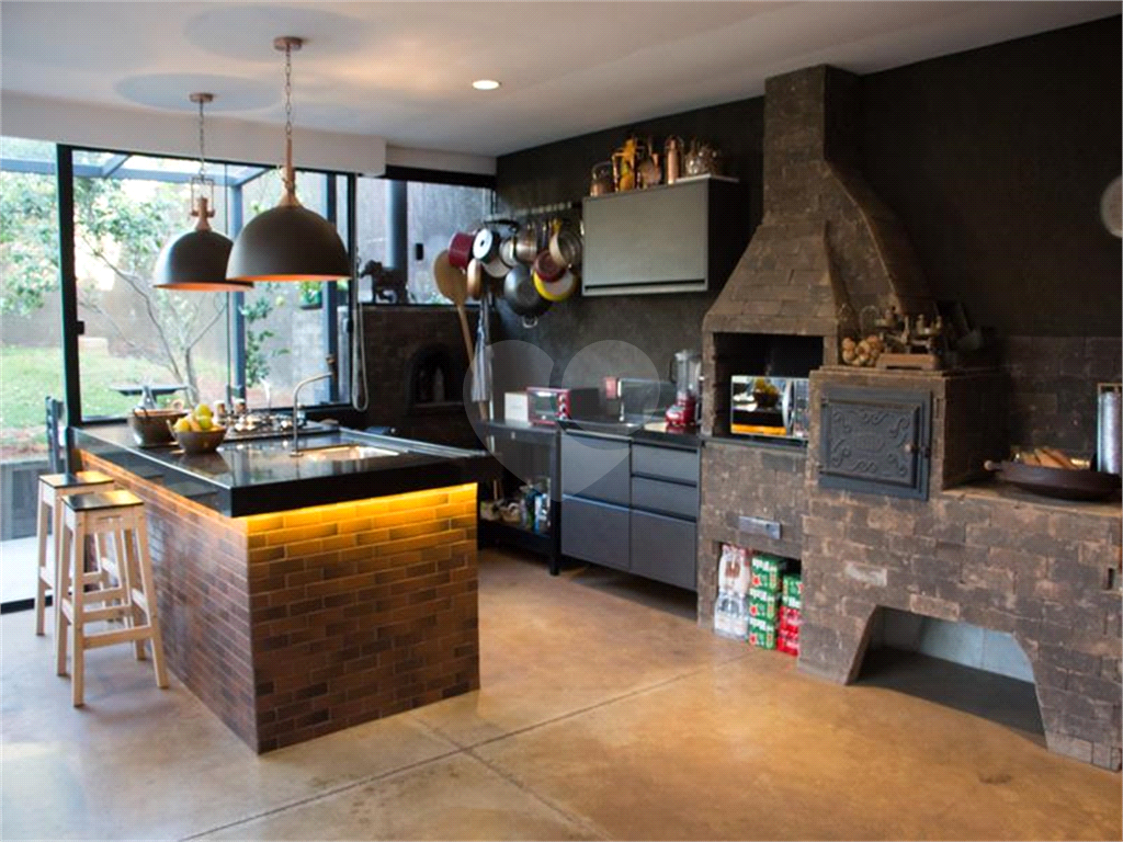 a lenha, forno de pizza , cook top em ilha c bancada de granitos e pias de apoio 1 na ilha e outra